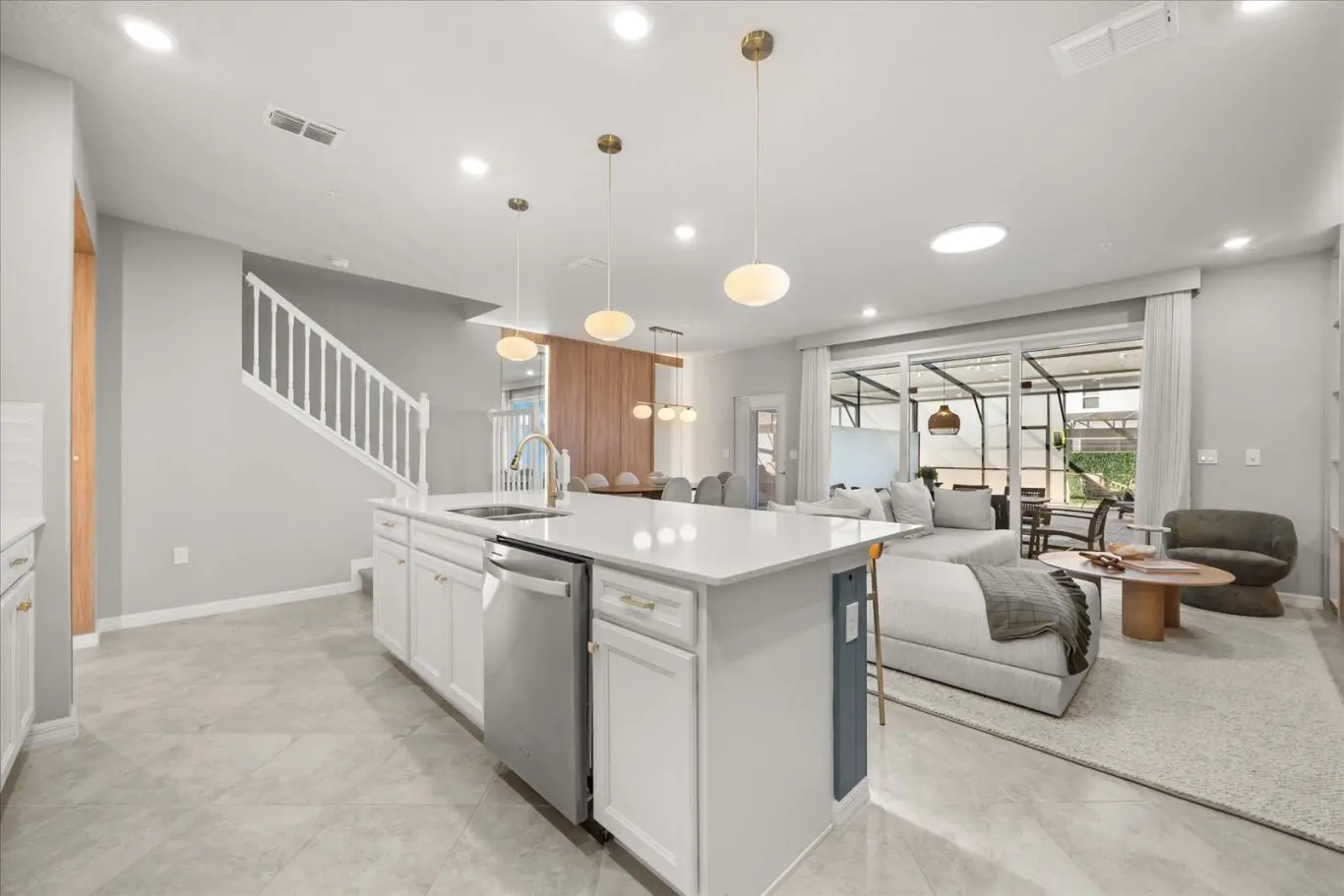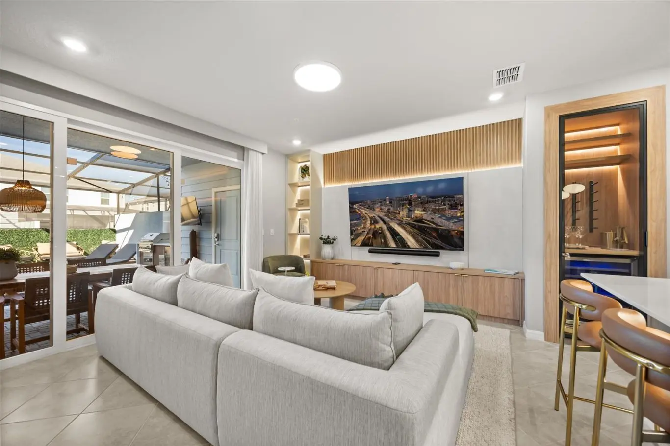 A sala de estar, a sala de jantar e a cozinha americana formam um espaço aberto e convidativo, ideal para reunir todos e compartilhar momentos únicos. O projeto de interiores valoriza o conforto e o design.