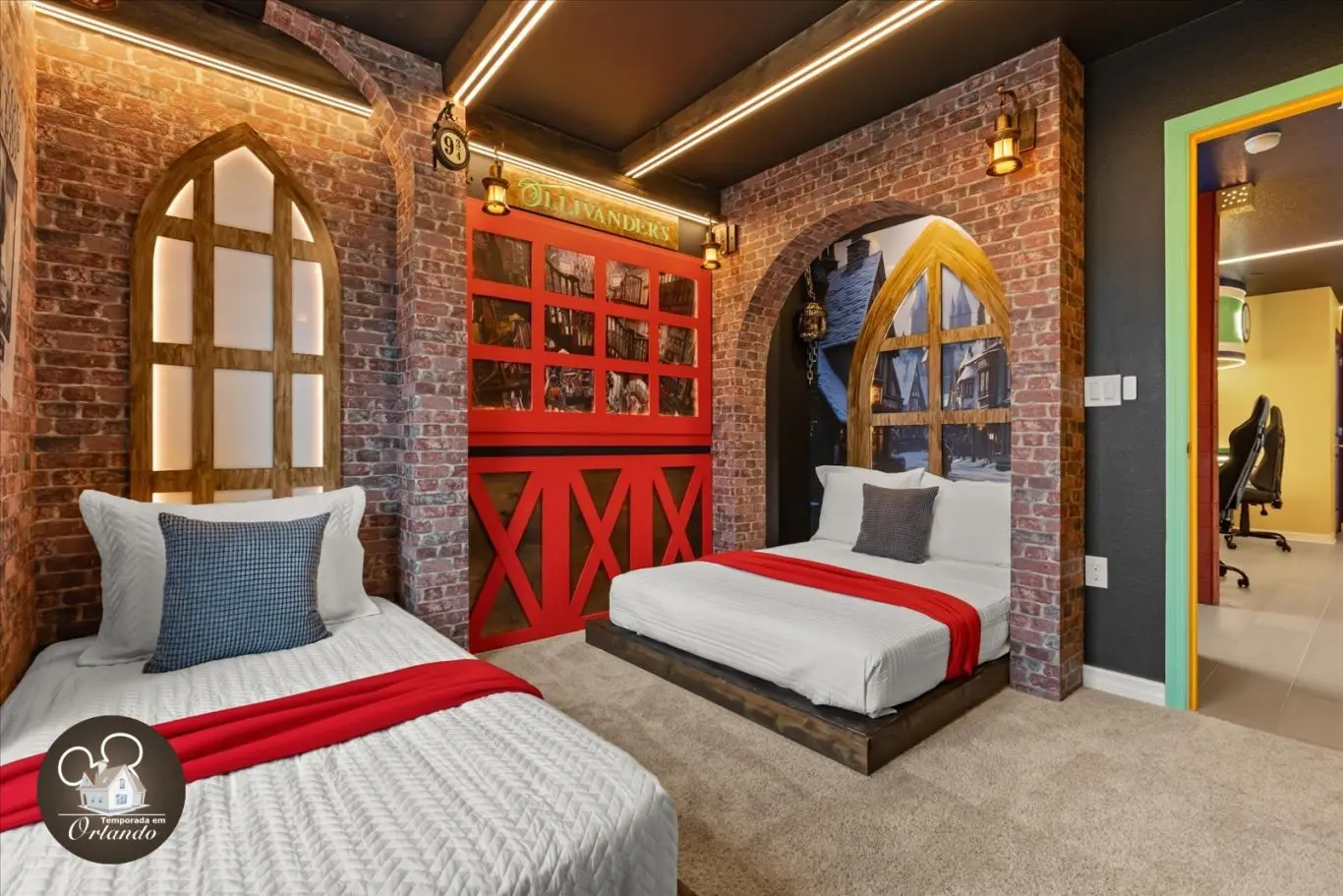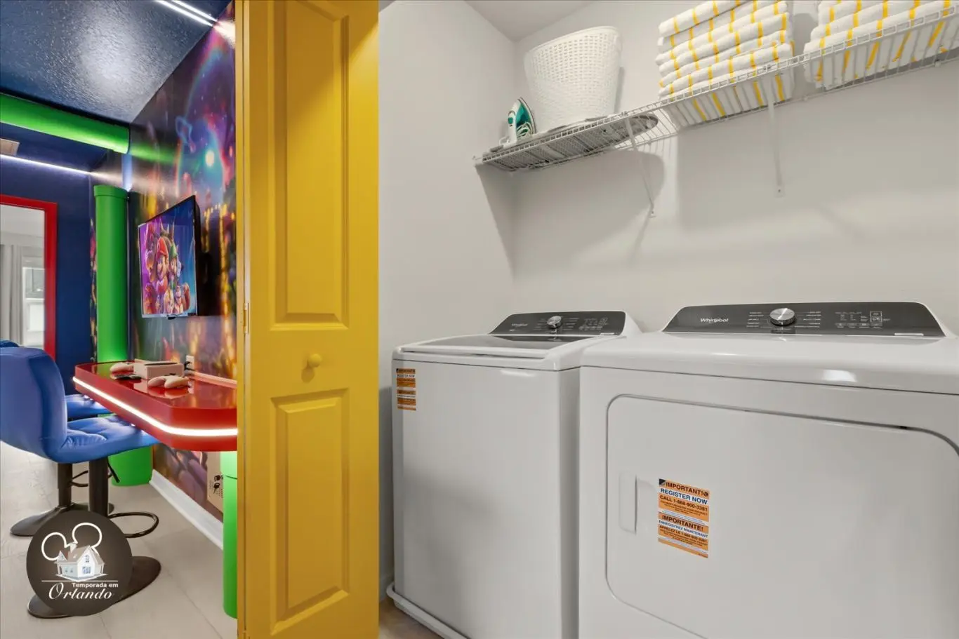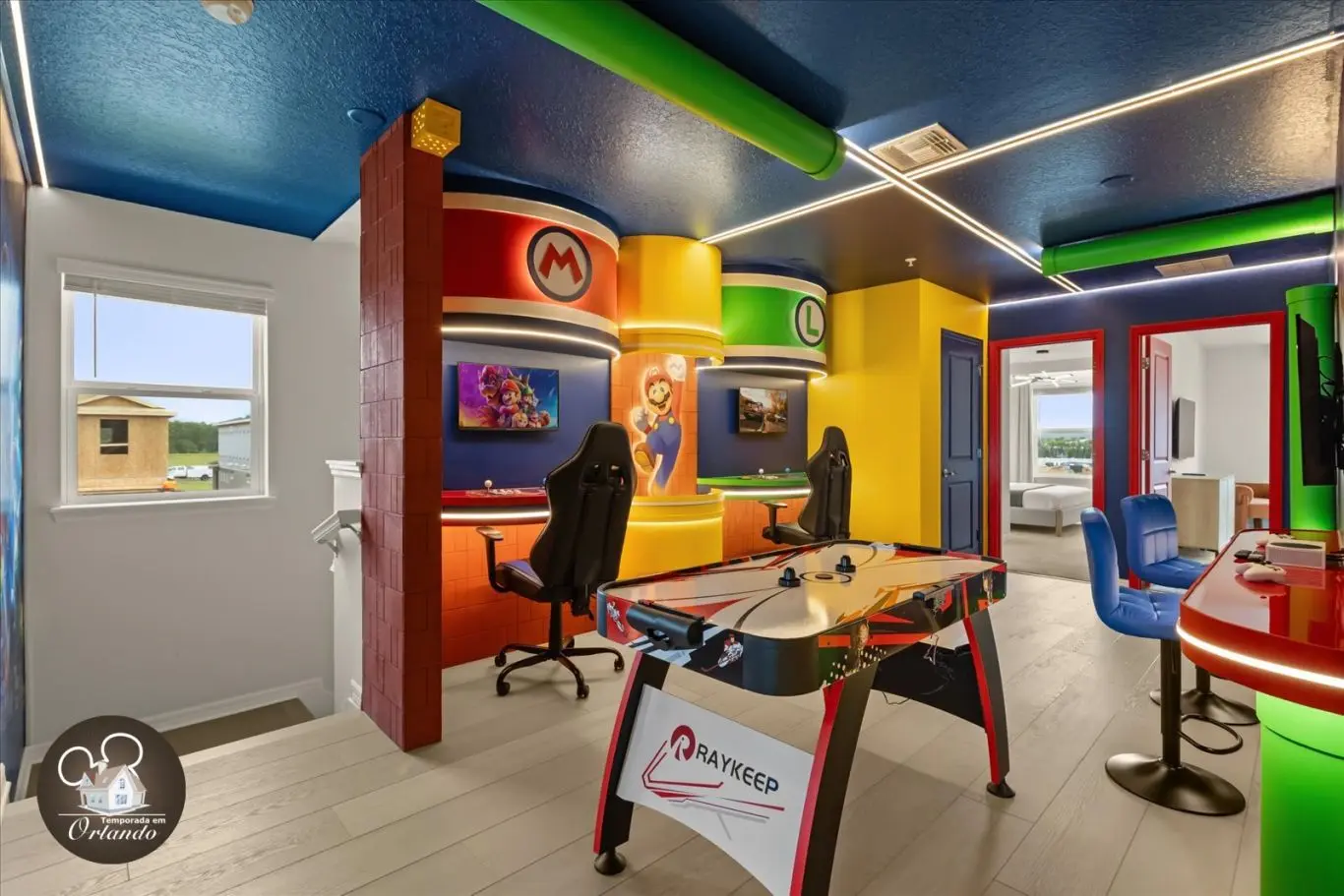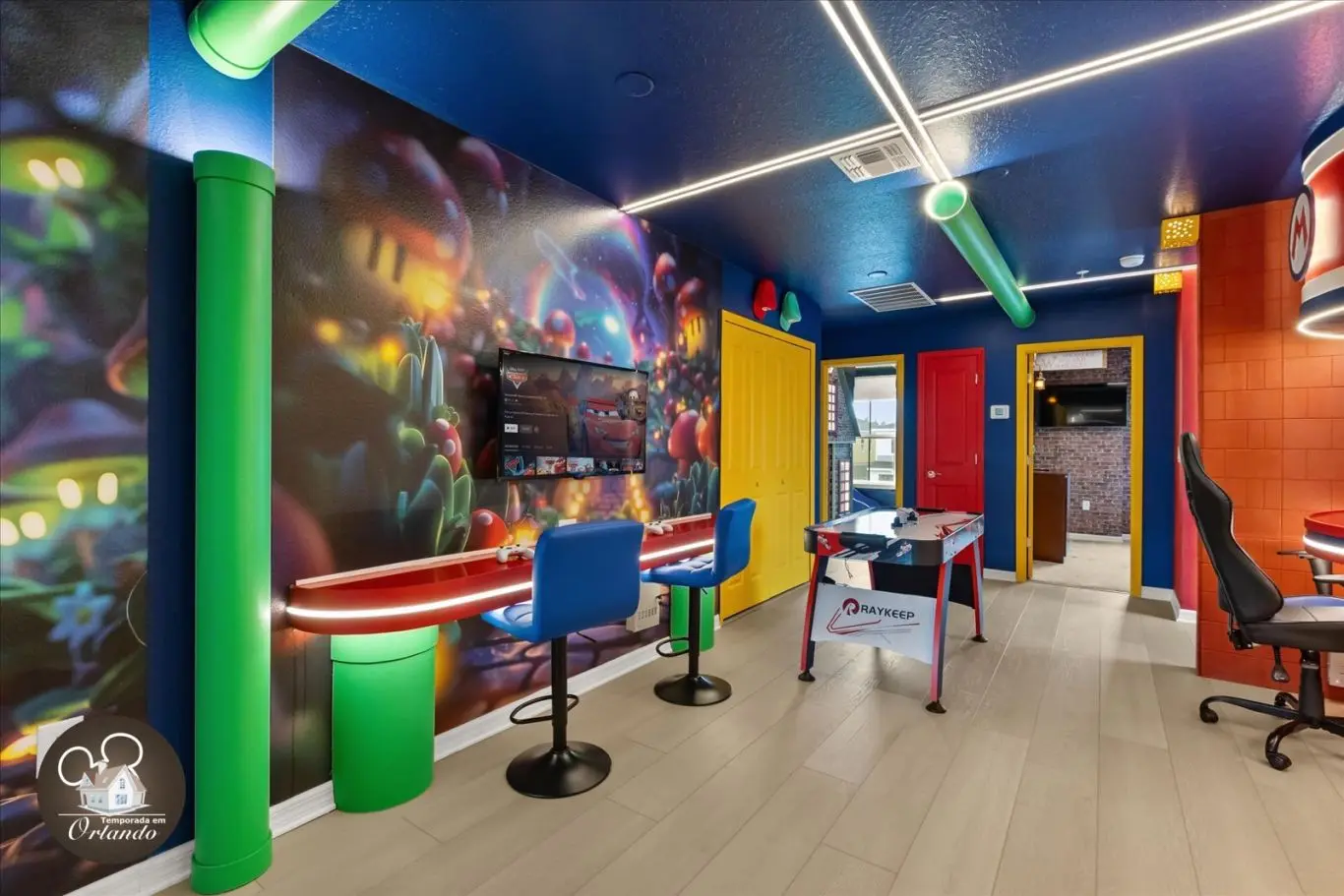 A "sala de jogos" foi decepcionante — um sistema estava quebrado e nunca foi consertado, e o Xbox não tinha jogos. Parece ótimo nas fotos, mas não prendeu a atenção dos nossos filhos por mais do que algumas horas no primeiro dia. A fechadura deslizante traseira estava quebrada no check-in (consertada no dia seguinte), e a máquina de gelo não funcionou durante metade da estadia. Havia também barulho de construção a partir das 5h da manhã. O ar-condicionado teve dificuldades com o clima de meados dos anos 80. Pagamos US$ 150 para aquecer a piscina; ficou muito quente, depois foi desligada completamente depois que pedimos para que fosse desligada. Também estava mais longe da Disney do que o esperado — há tráfego intenso na região, levou mais de 35 minutos. A casa parece bonita, mas não tem o básico: não há assentos suficientes para 12 pessoas, suprimentos de cozinha mínimos (sem assadeira), sem toalhas de piscina e toalhas de banho insuficientes. Positivos: ótimos quartos temáticos e excelente localização, a dois quarteirões do parque aquático. No geral, bom — mas poderia ser muito melhor com mais atenção e cuidado com a experiência do hóspede.