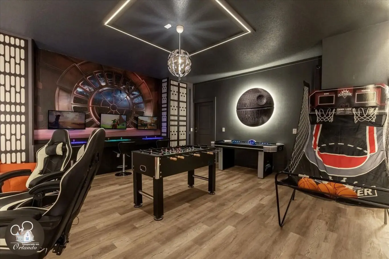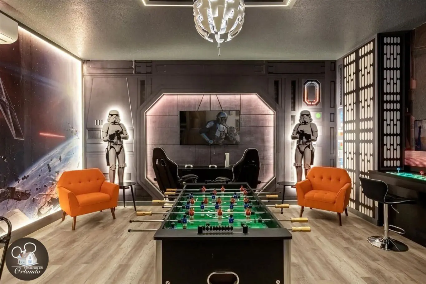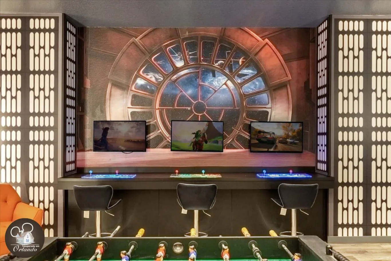 Para os entusiastas de jogos, nossa mansão oferece um salão de jogos de última geração, completo. É o local perfeito para se divertir em um ambiente descontraído.