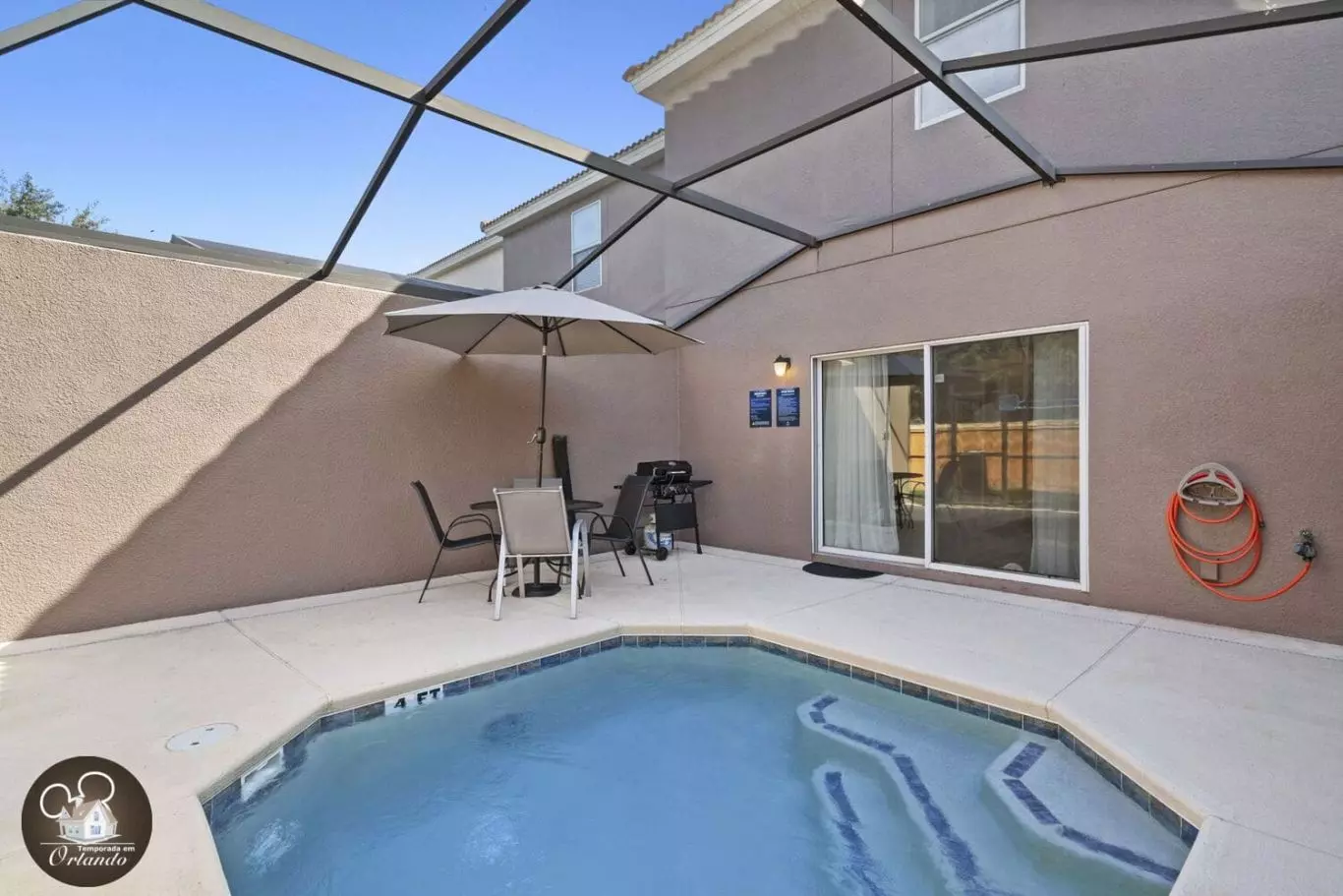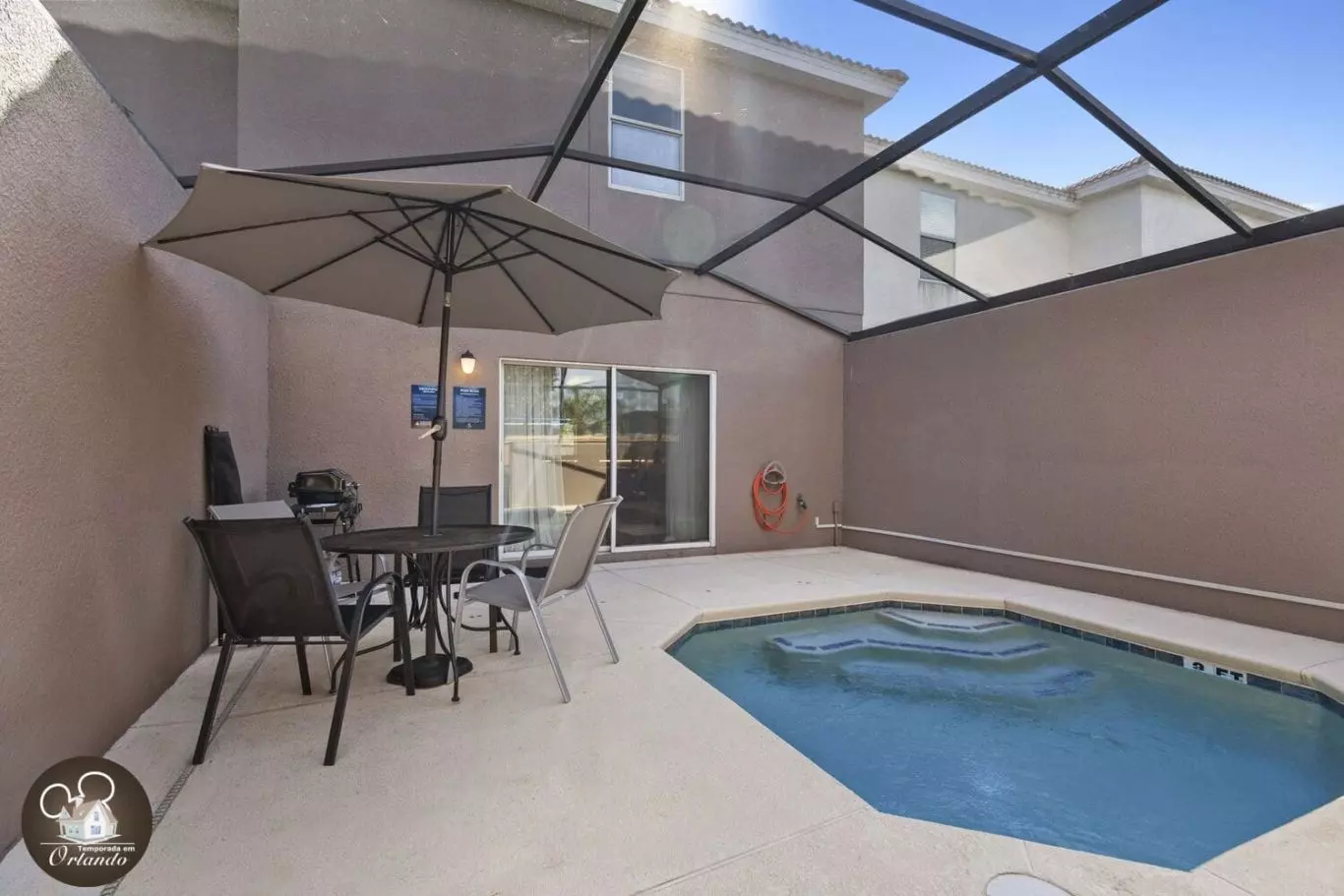 A área externa oferece uma piscina exclusiva, perfeita para relaxar após um dia nos parques ou simplesmente aproveitar o clima ensolarado de Orlando.