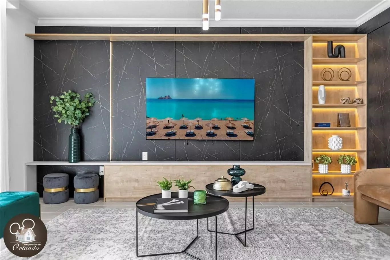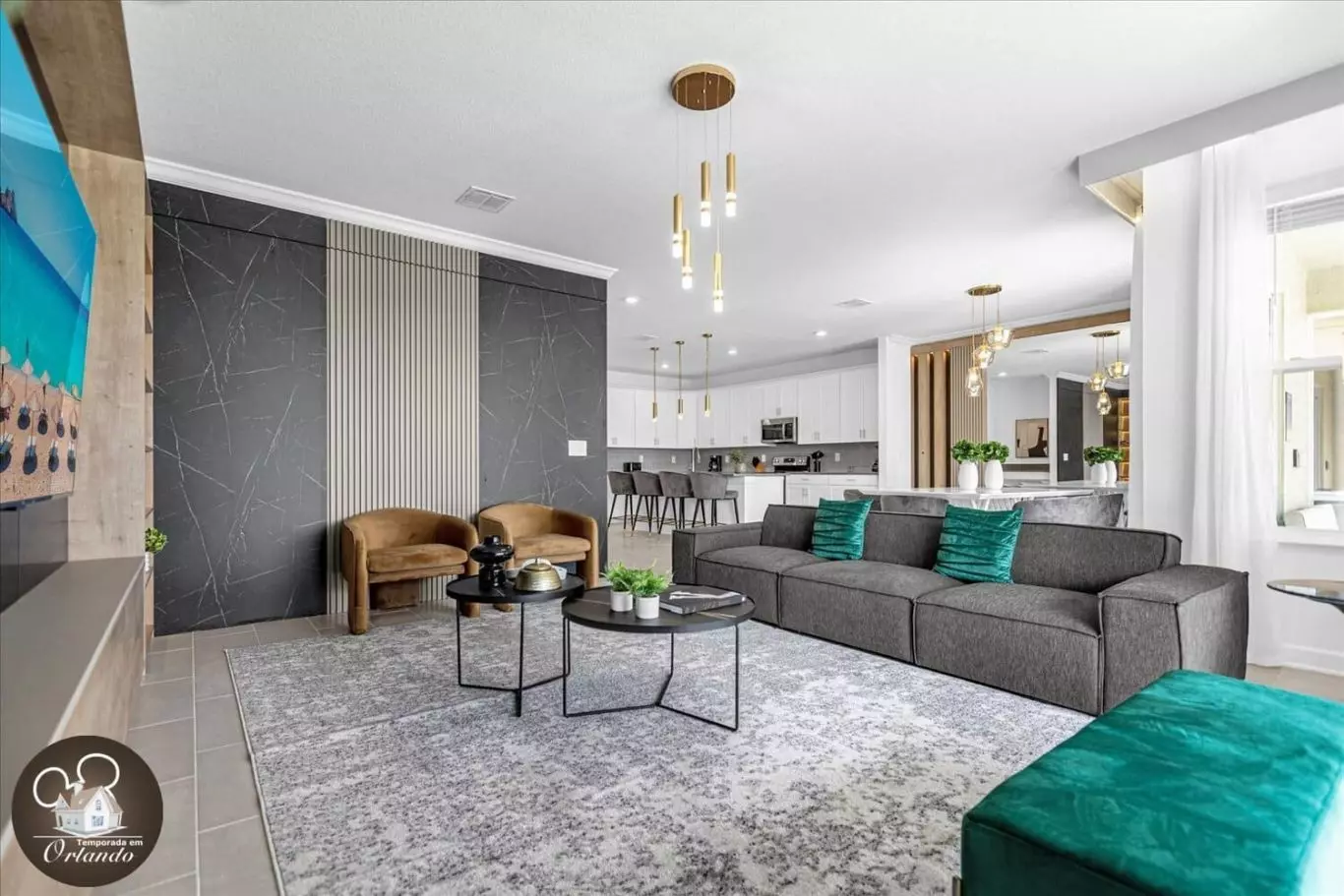 Ambientes internos amplos e bem decorados criam um cenário acolhedor e elegante desde a entrada. A integração entre as salas e a cozinha proporciona momentos compartilhados e práticos para todos os estilos de estadia.