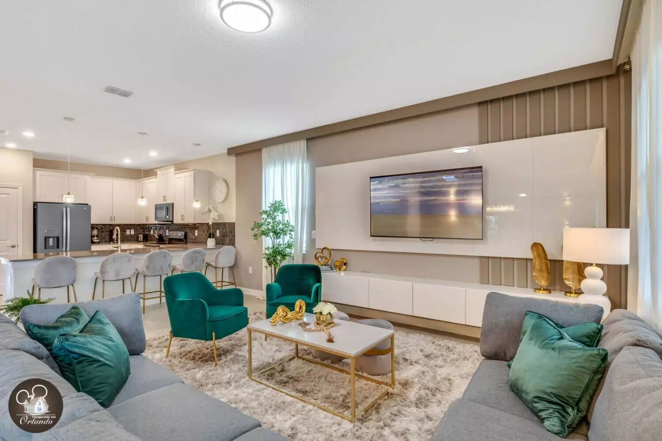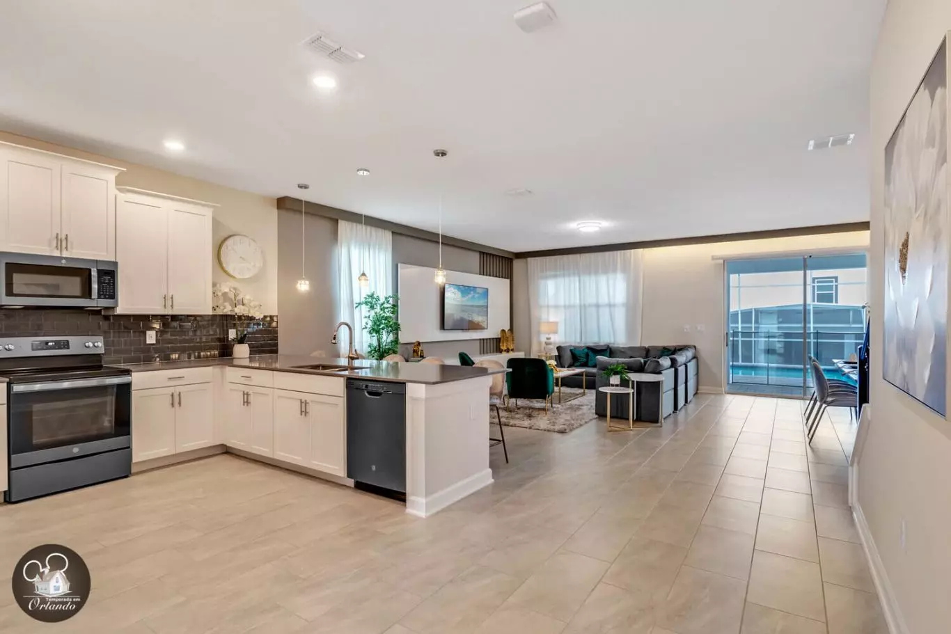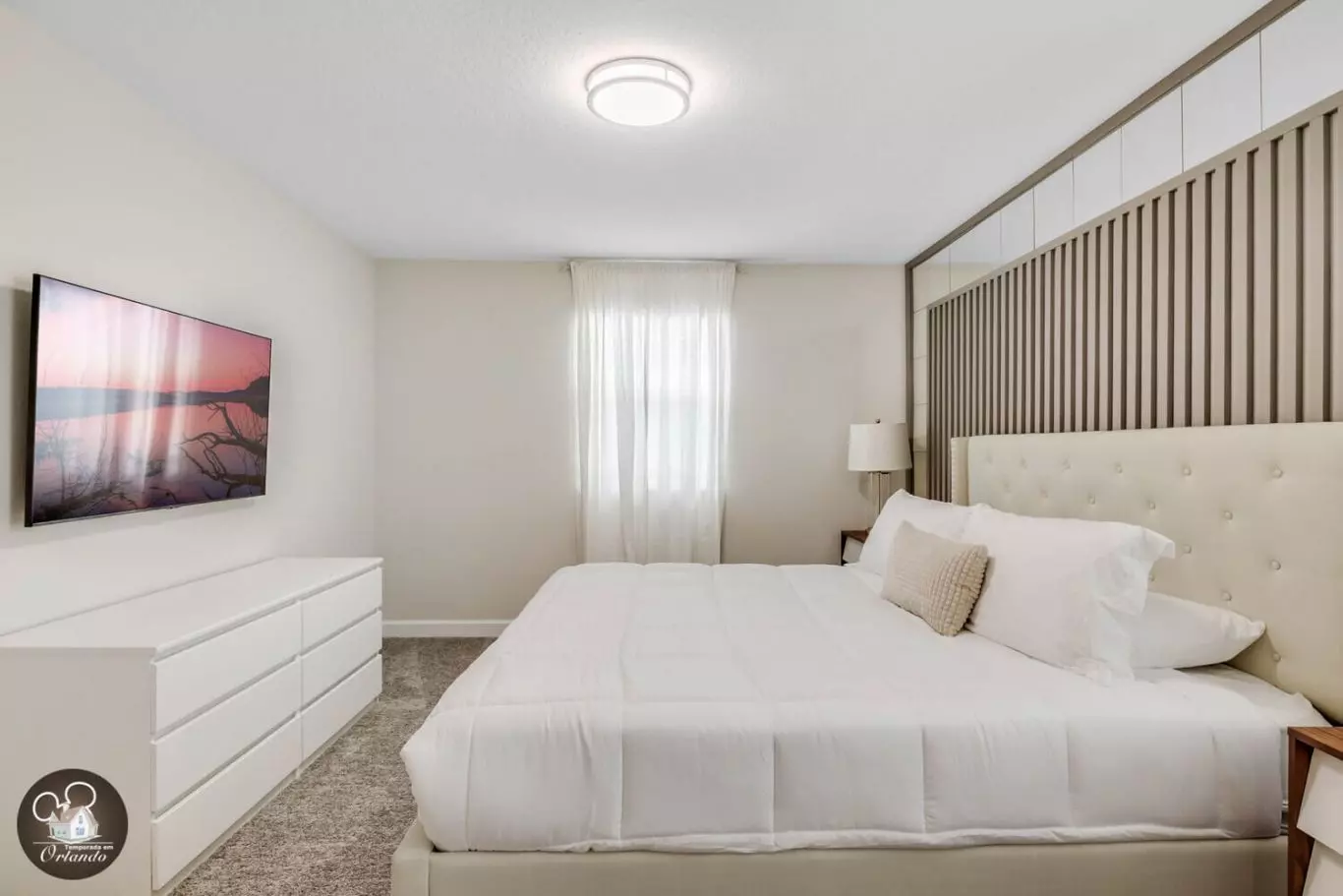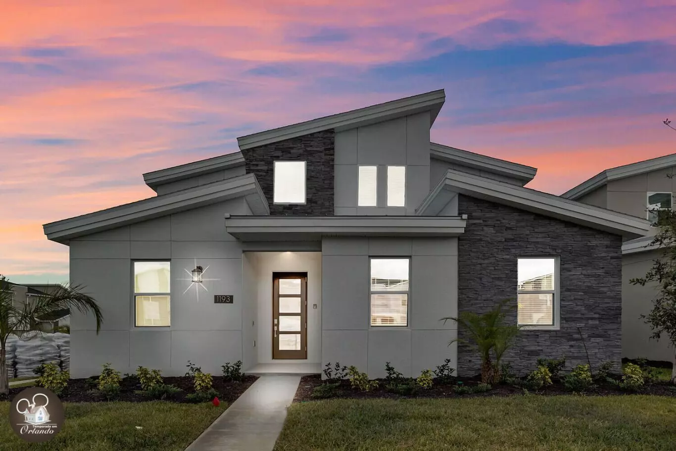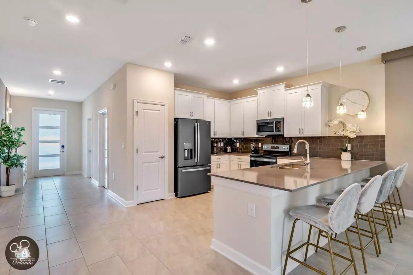 Linda casa contemporânea feita para o espaço perfeito para reuniões familiares - quartos para crianças e quartos próximos para os pais. Escolhida principalmente pela quantidade de camas king-size disponíveis, esta casa era muito maior do que o esperado! Tapetes, lençóis e até almofadas e decoração de pelúcia do Mickey Mouse pareciam limpos e os banheiros estavam todos obviamente higienizados. Embora pudéssemos ter usado mais toalhas e papel higiênico, houve um amplo aviso nas primeiras instruções de que o fornecimento de produtos de higiene pessoal era limitado. Não tivemos problemas com as entregas da InstaCart atrás do portão e havia uma lavadora/secadora de tamanho normal que usamos bem. Noites de 50 graus, desfrutamos da piscina muito quente e da banheira de hidromassagem. As casas vizinhas são muito próximas umas das outras, mas a disposição em terraços deu a cada pátio alguma privacidade; bairro parecia seguro o suficiente para caminhar à noite. Mais longe do que alguns outros aluguéis disponíveis (2 saídas na I4 para a Disney ~ 20 minutos com tráfego de construção), a sensação luxuosa e o espaço extra valeram a diferença.