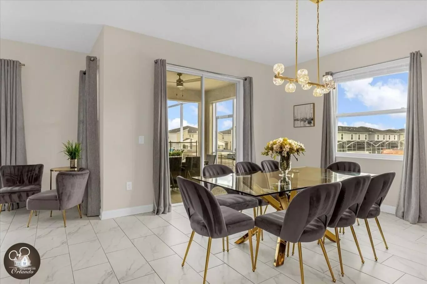 A casa acomoda grandes grupos com tranquilidade, proporcionando uma experiência confortável e memorável em Orlando.