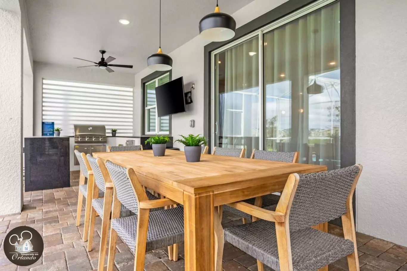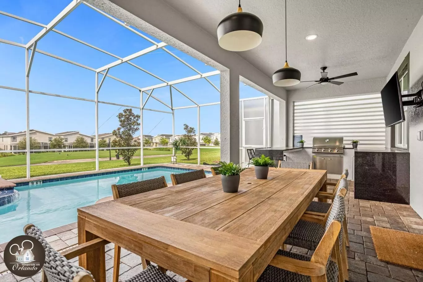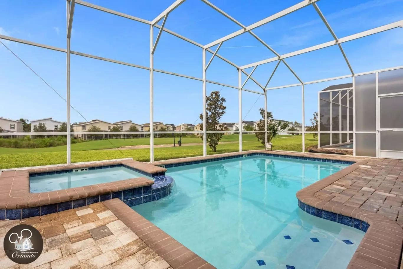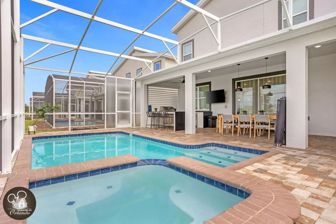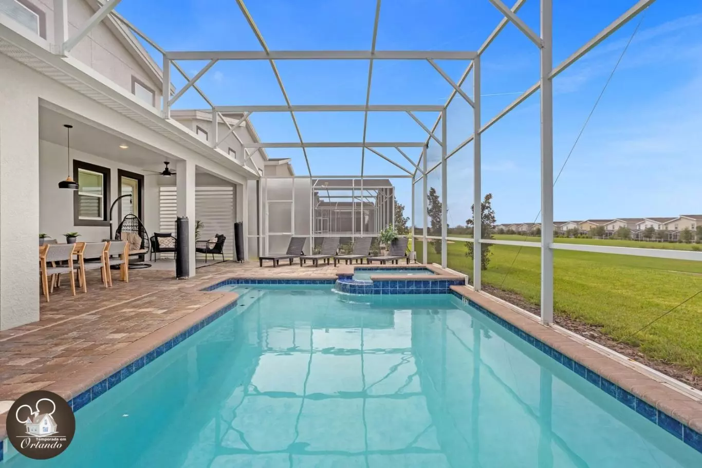 A piscina privativa com jacuzzi é o verdadeiro ponto de encontro da casa. Espreguiçadeiras confortáveis, ambiente arejado e espaço amplo tornam este o lugar ideal para relaxar após um dia nos parques.