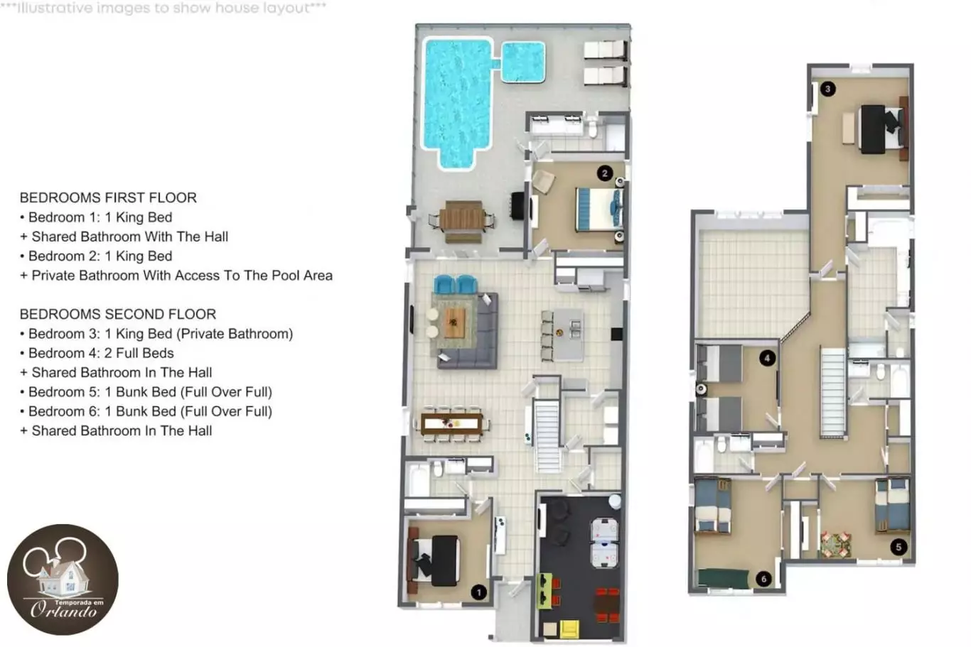 A casa possui 6 quartos distribuídos entre os dois andares, com camas king, beliches e camas de casal tudo pensado para acomodar até 18 pessoas com privacidade e conforto.