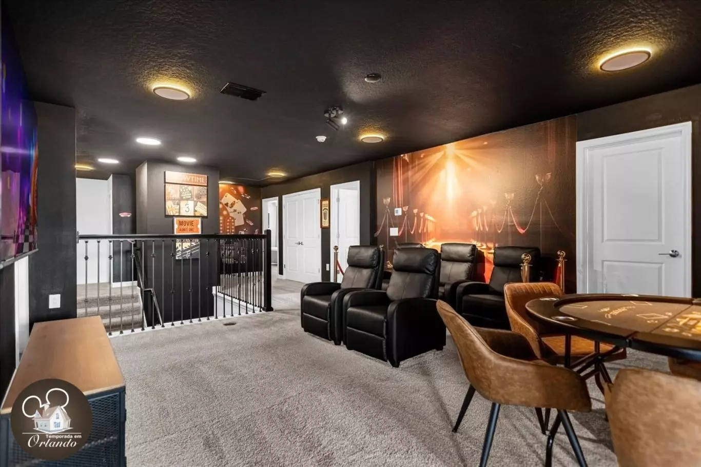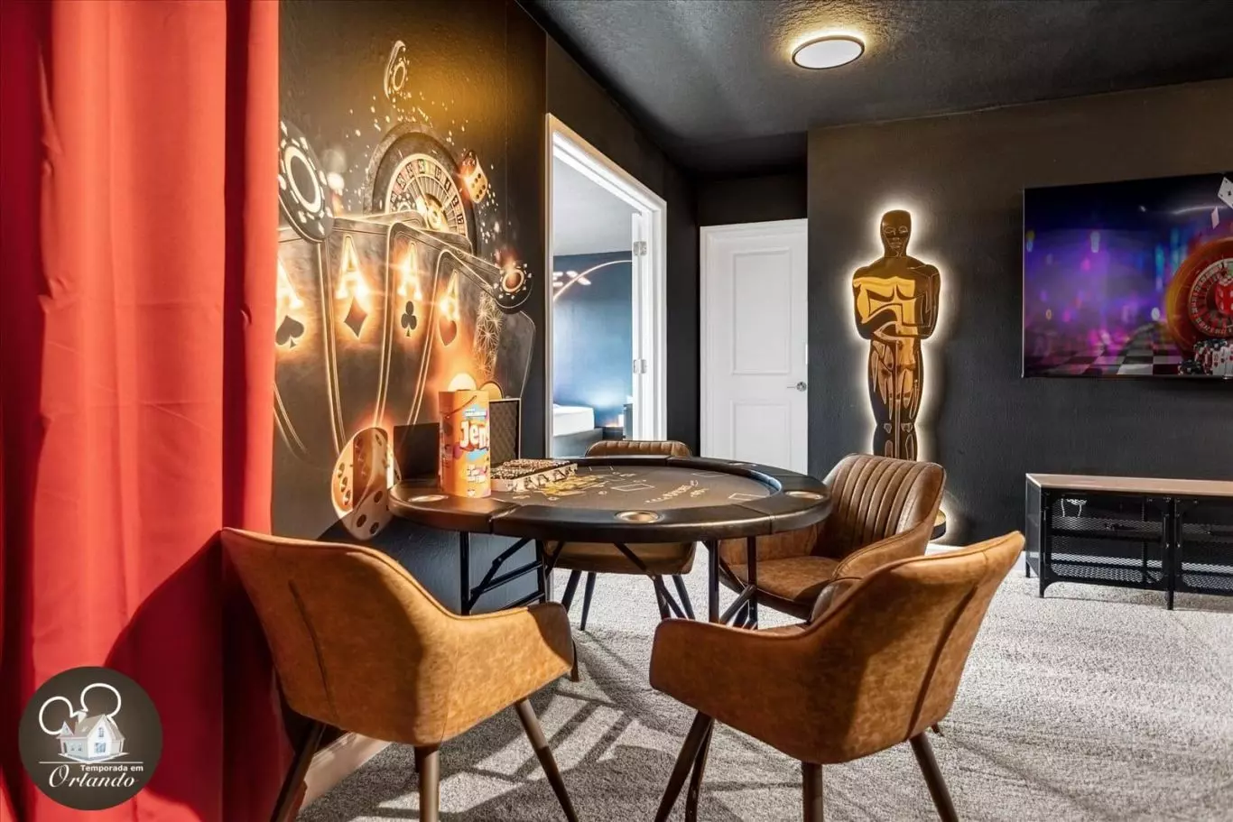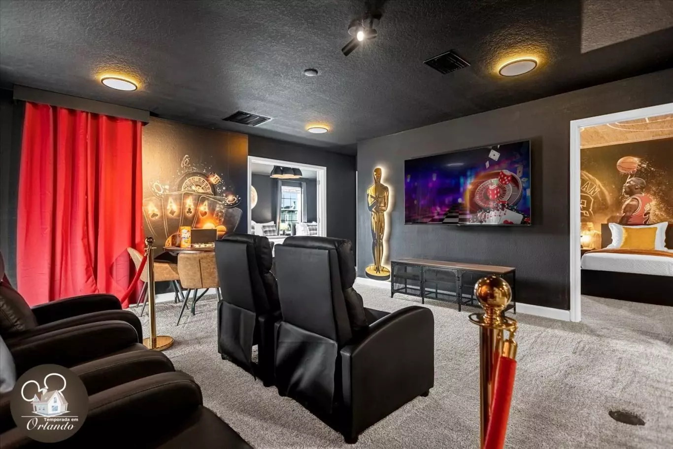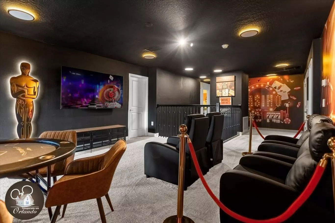 A casa conta com uma sala de cinema privativa, poltronas confortáveis e ambiente ideal para relaxar. O salão de jogos é completo e perfeito para curtir momentos descontraídos com o grupo. Já a área externa oferece uma piscina privativa aquecida com jacuzzi — ideal para descanso após um dia nos parques.