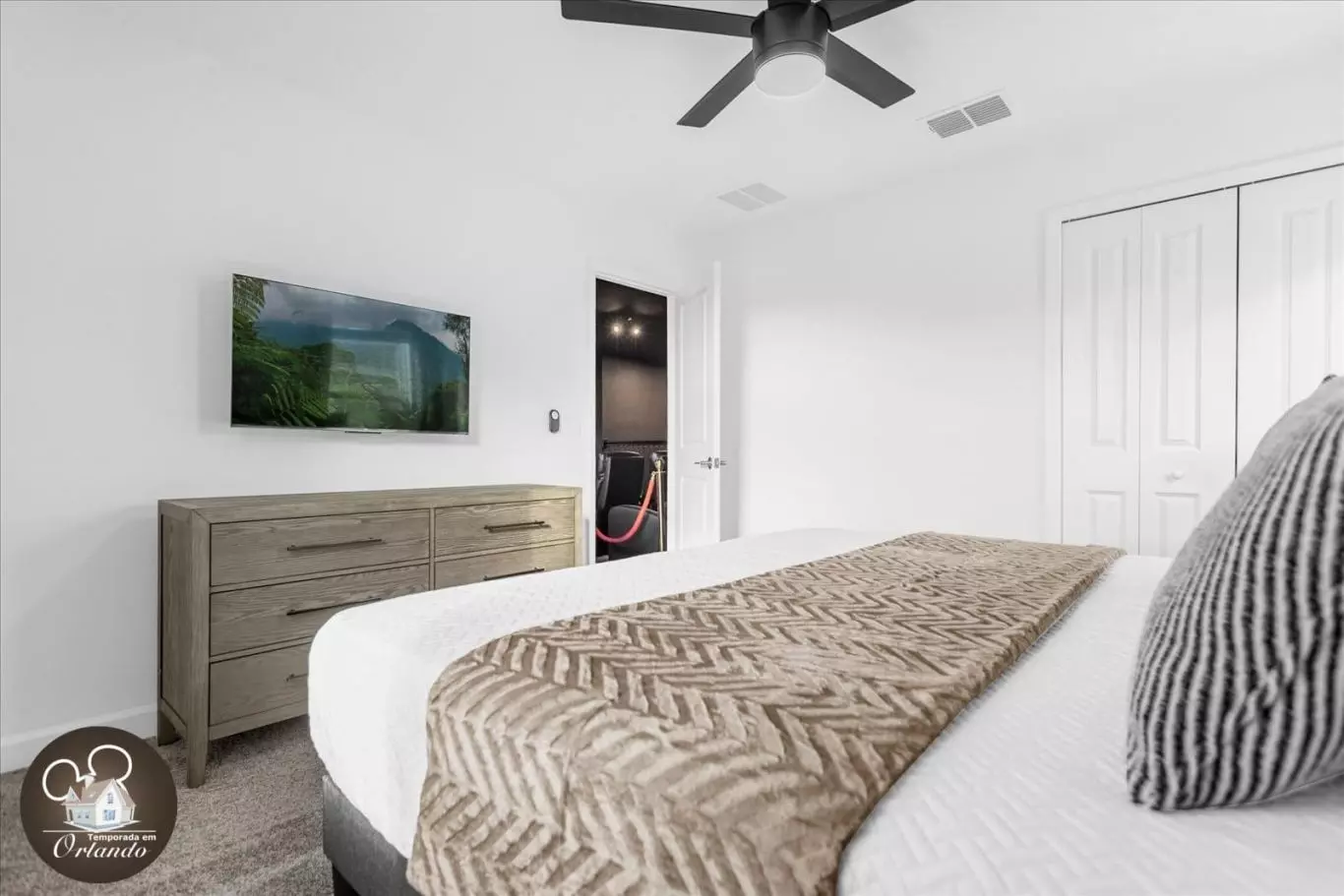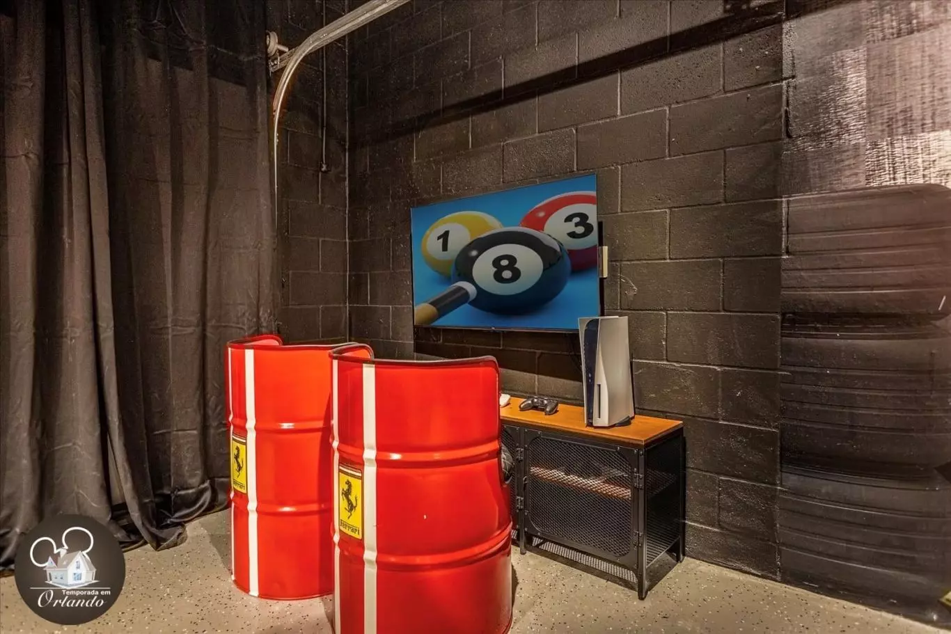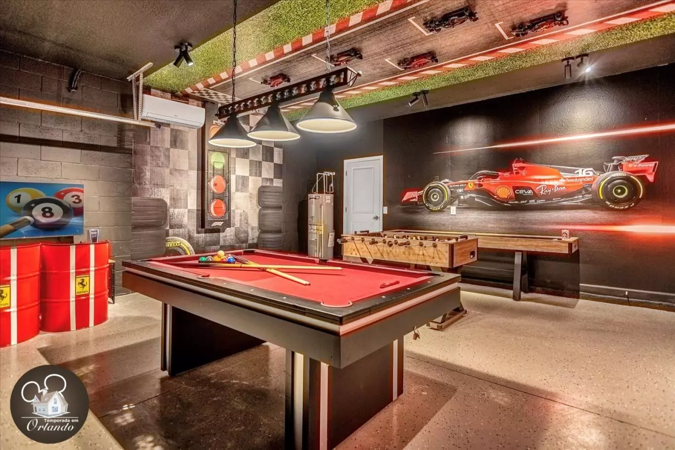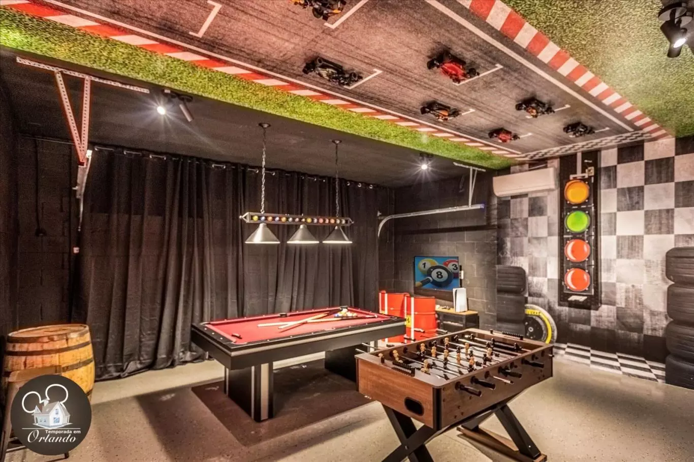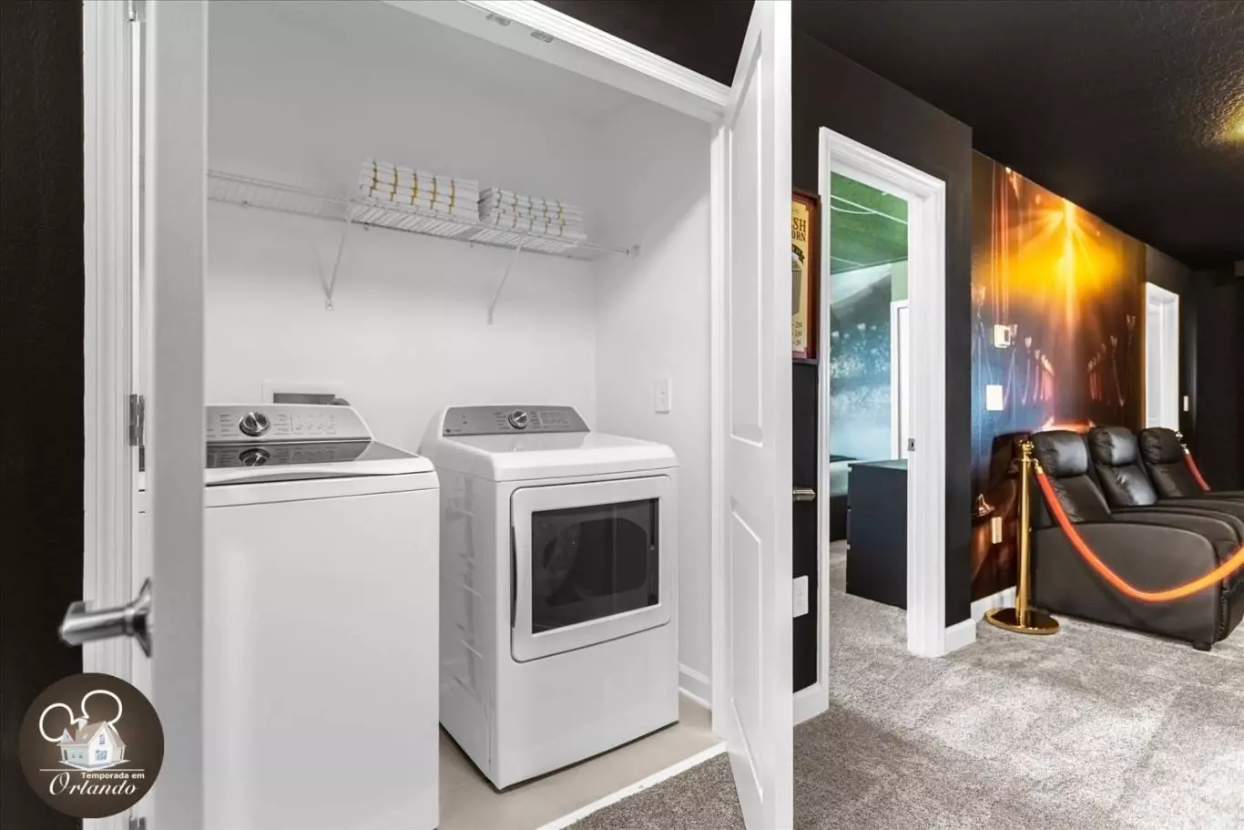A casa conta com uma sala de cinema privativa, poltronas confortáveis e ambiente ideal para relaxar. O salão de jogos é completo e perfeito para curtir momentos descontraídos com o grupo. Já a área externa oferece uma piscina privativa aquecida com jacuzzi — ideal para descanso após um dia nos parques.