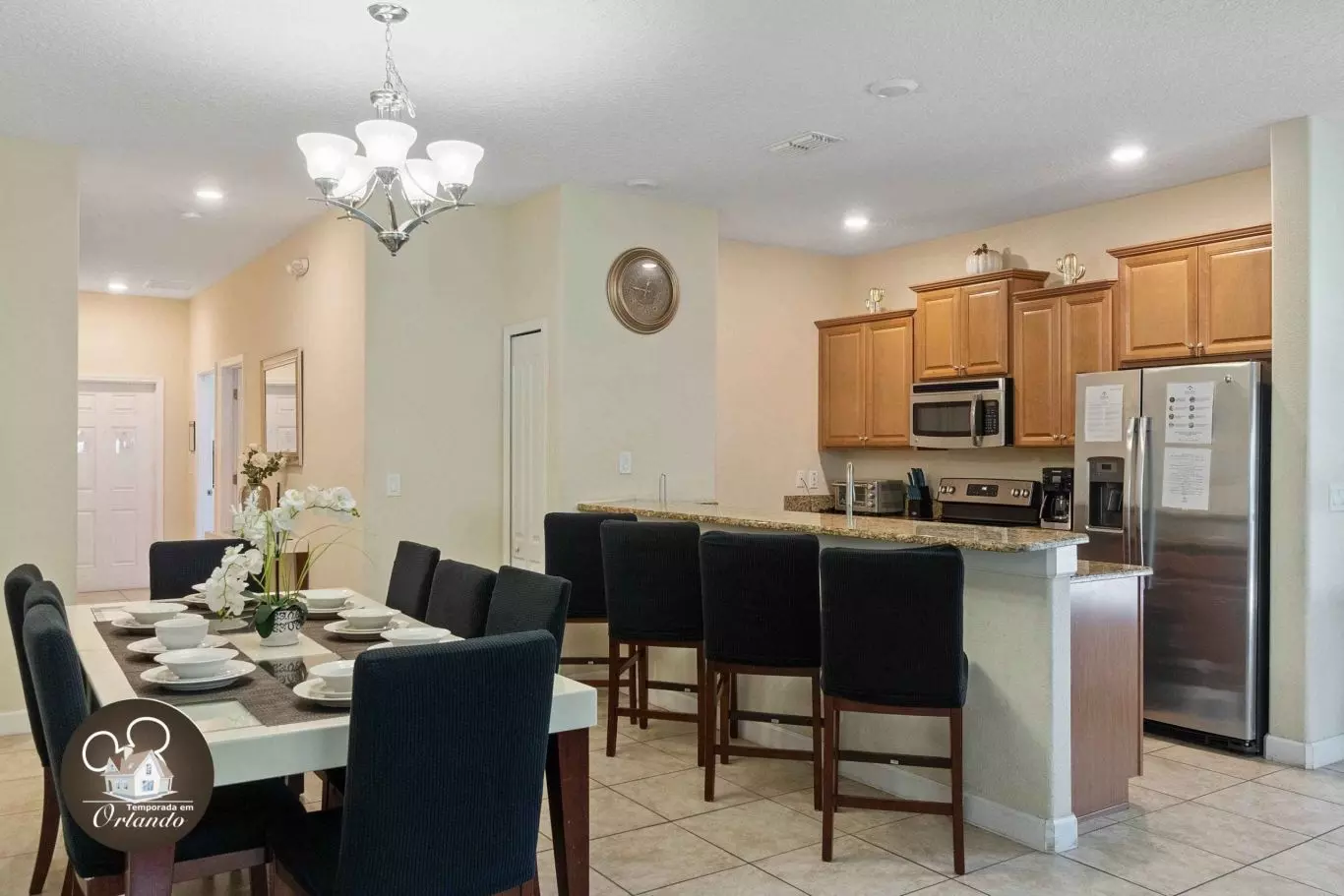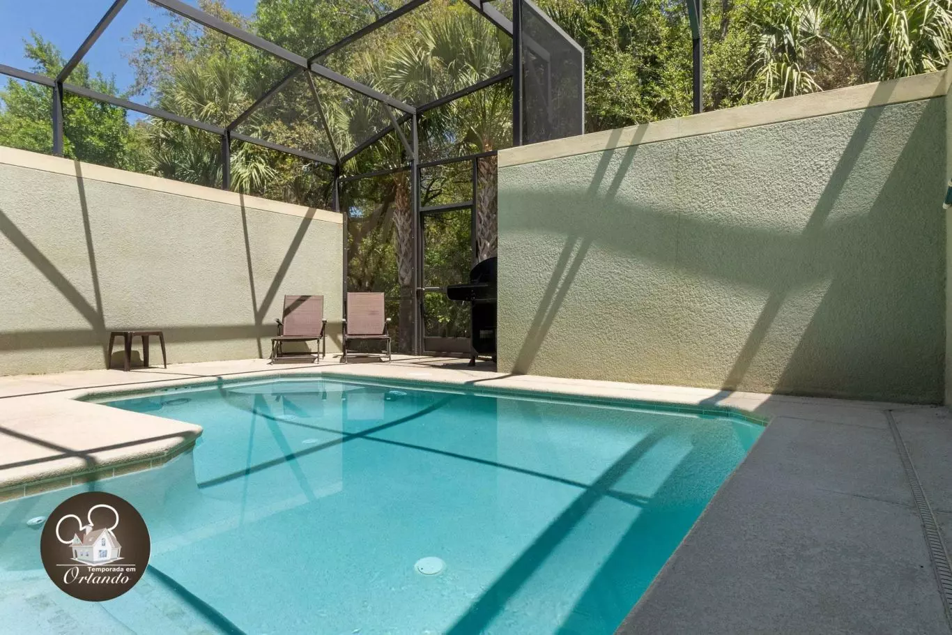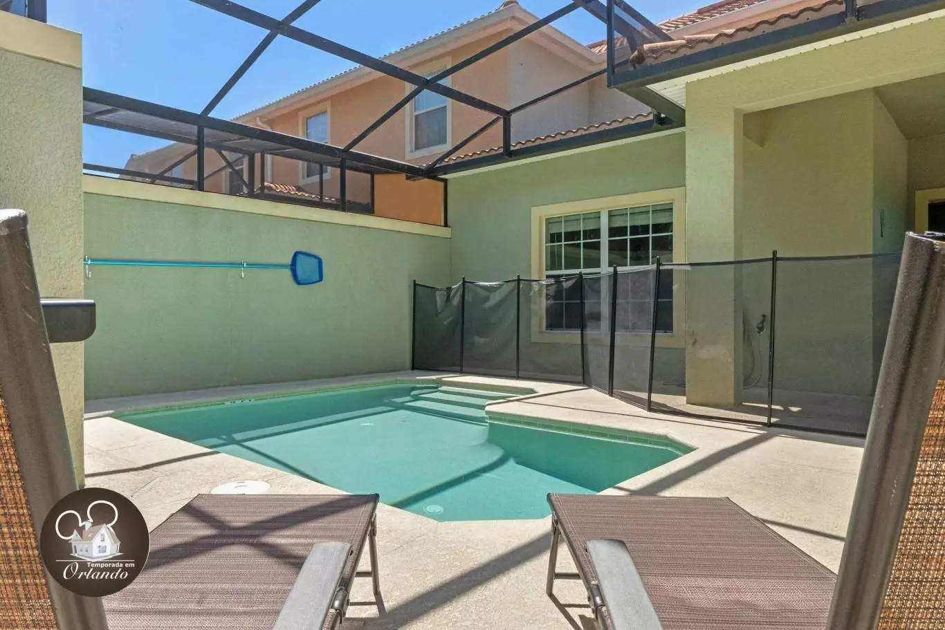 A área externa conta com uma piscina privativa, perfeita para relaxar e aproveitar o melhor das férias em Orlando.