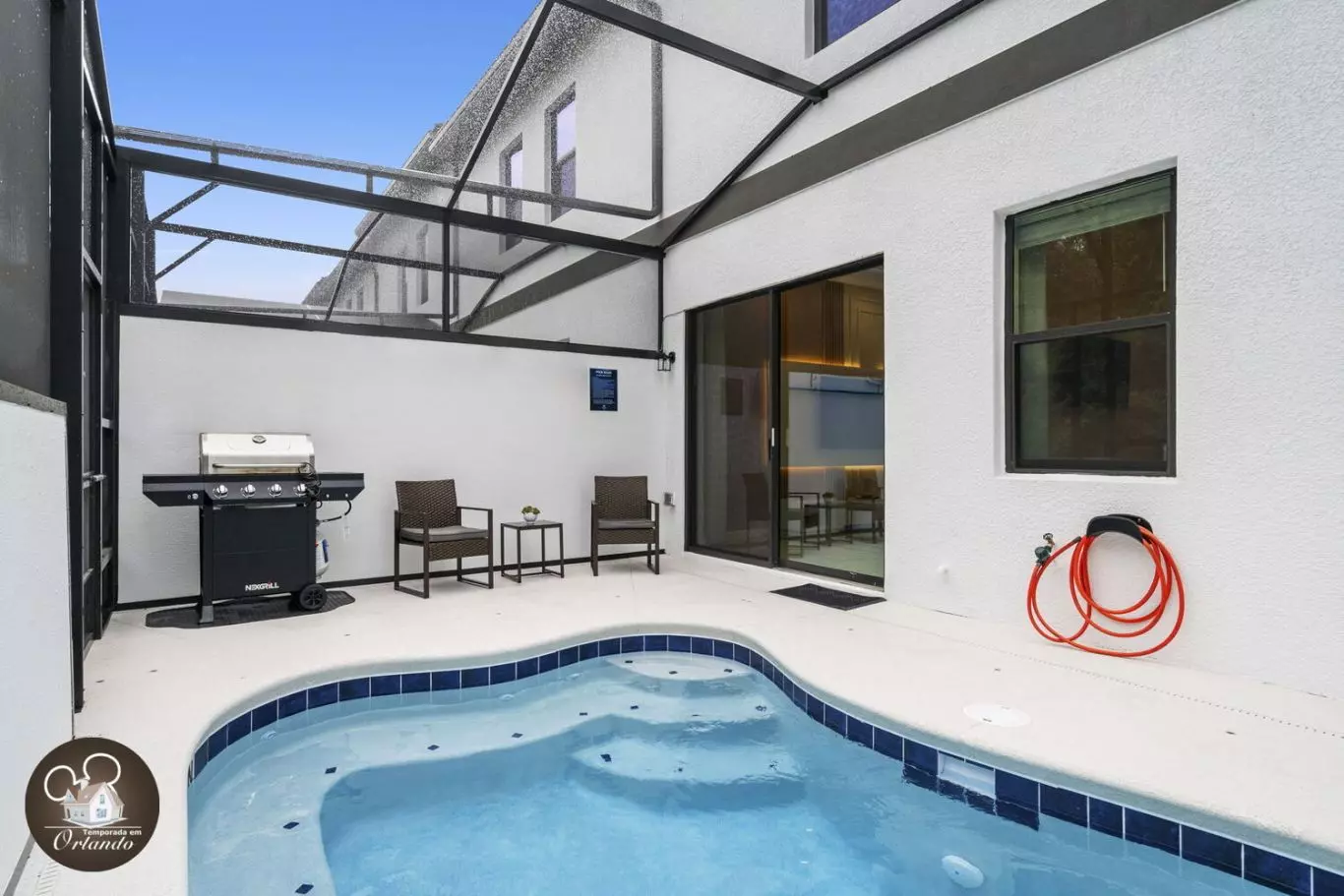 A área externa conta com uma piscina perfeita para aproveitar o sol da Flórida, relaxar nas espreguiçadeiras ou se refrescar depois de um dia intenso nos parques. Ideal para adultos e crianças curtirem juntos.