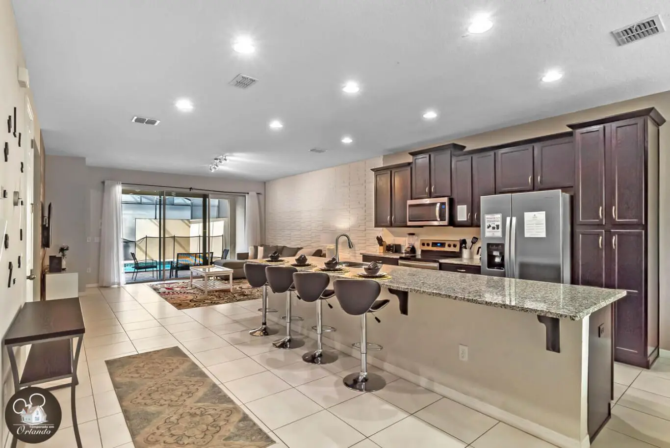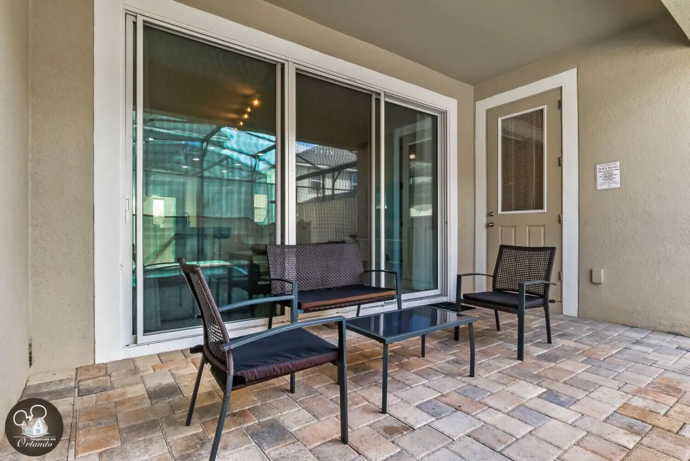 Nos fundos da casa, a área externa oferece uma piscina privativa perfeita para os dias ensolarados da Flórida. Relaxe após um dia de parque ou aproveite o espaço para momentos agradáveis com quem você ama.