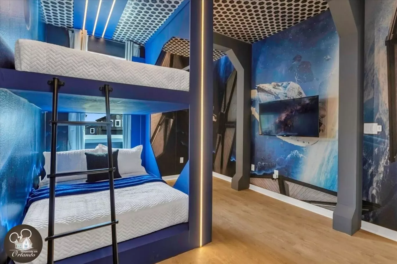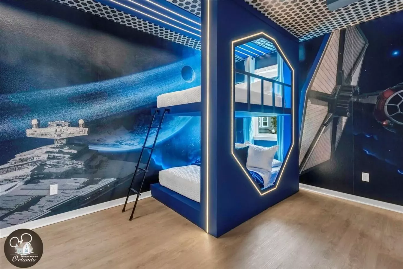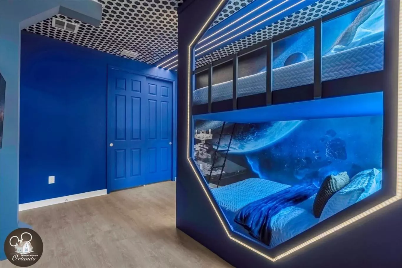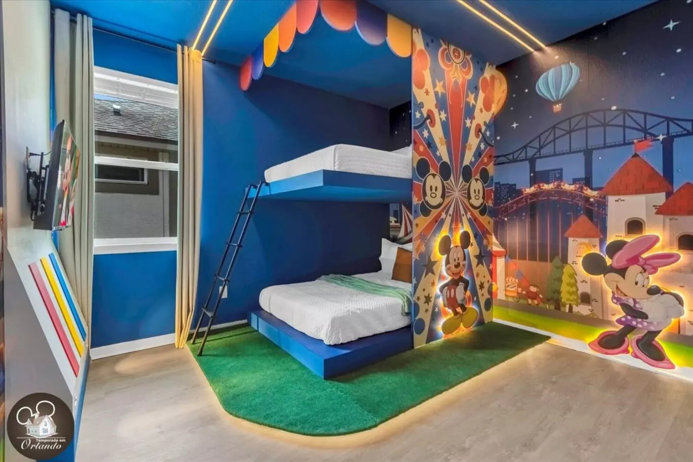 Esta casa era muito legal, é uma grande opção com quartos temáticos muito interessantes! O cinema do parque Jurassic foi incrível! Meus filhos adoravam a sala de jogos, a sala do Mickey e as estrelas. Ficamos aqui por 5 dias e adoramos! No entanto, pensei que o berço ficaria em um dos quartos das crianças e não cabe na porta, por isso, se você quiser que seu bebê durma em seu quarto, traga um pack n play.