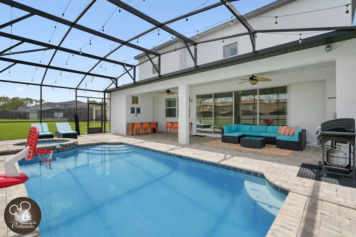 Relaxe na área externa com espreguiçadeiras e uma piscina privativa perfeita para os dias de calor da Flórida. Ideal para momentos de descanso após os parques ou confraternizações com o grupo.