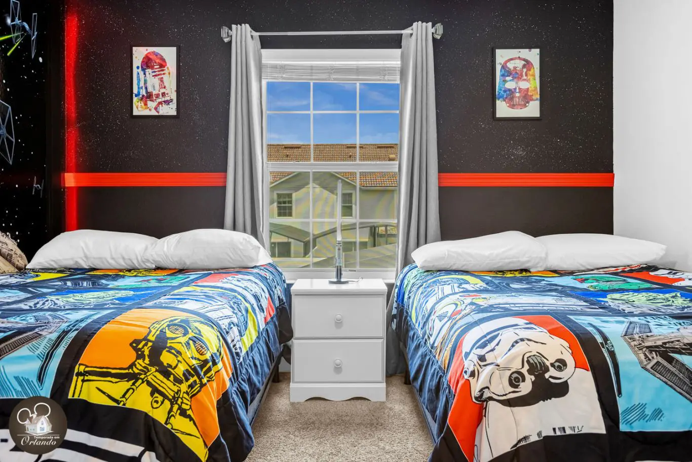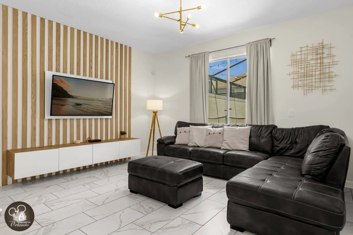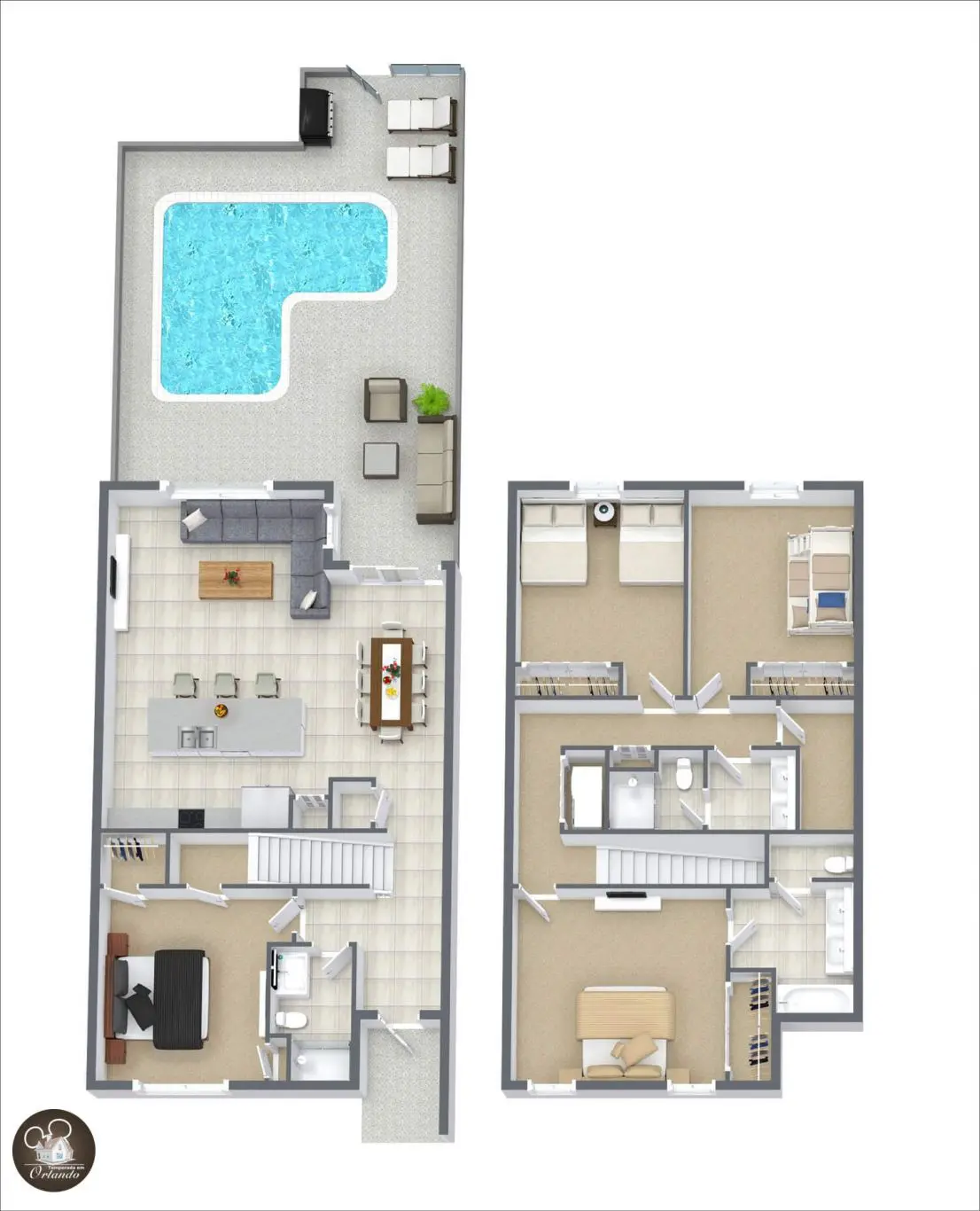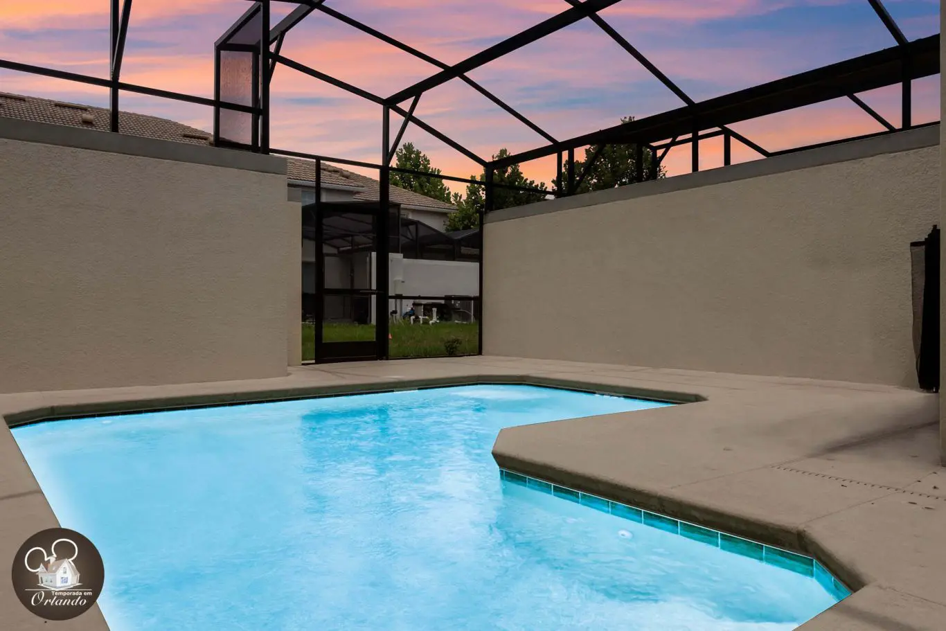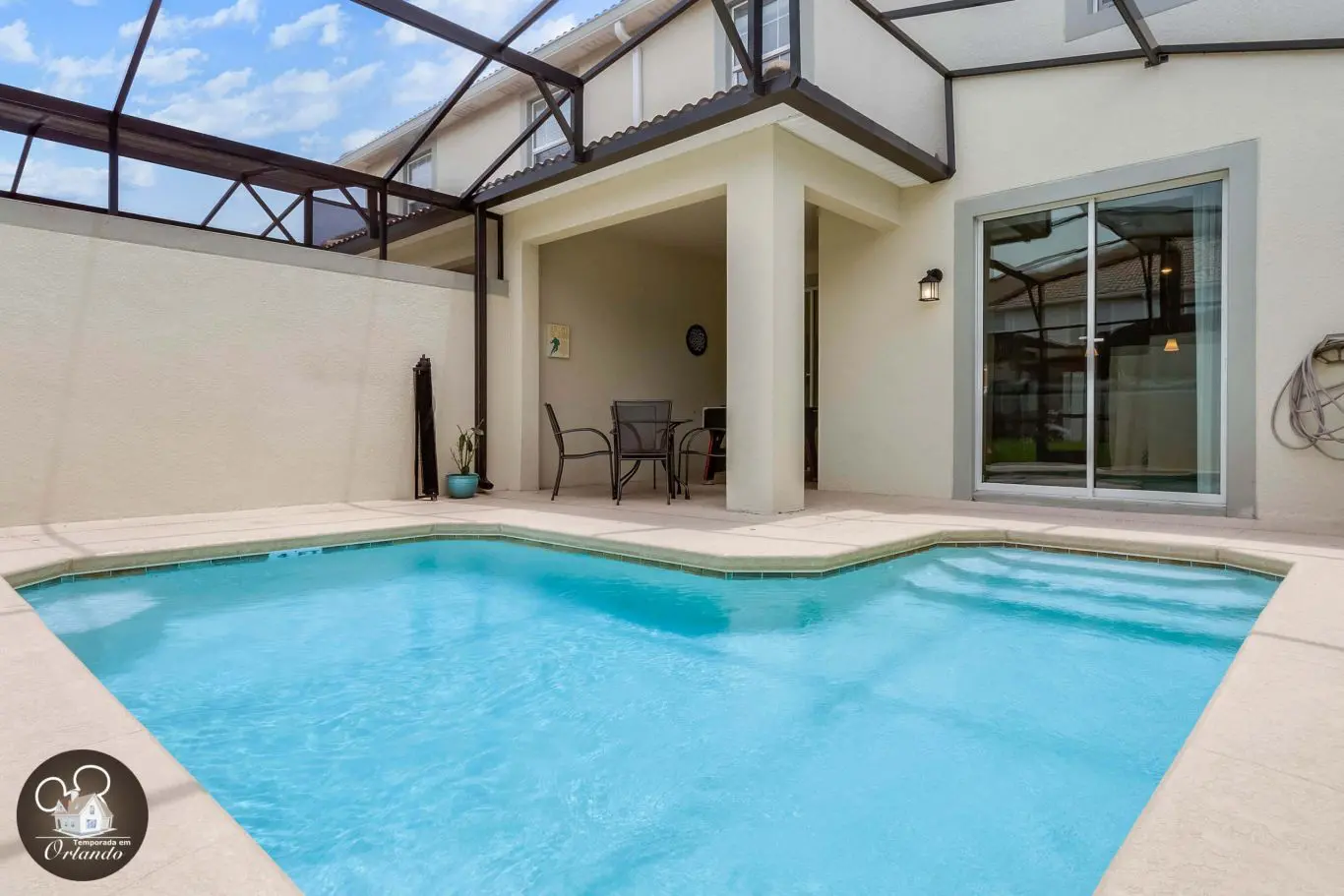 A área externa conta com uma piscina perfeita para relaxar após um dia de parque ou curtir um momento tranquilo em família. O acesso direto pela sala torna tudo ainda mais prático.