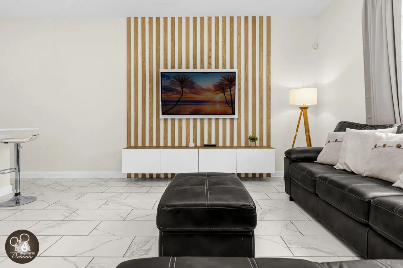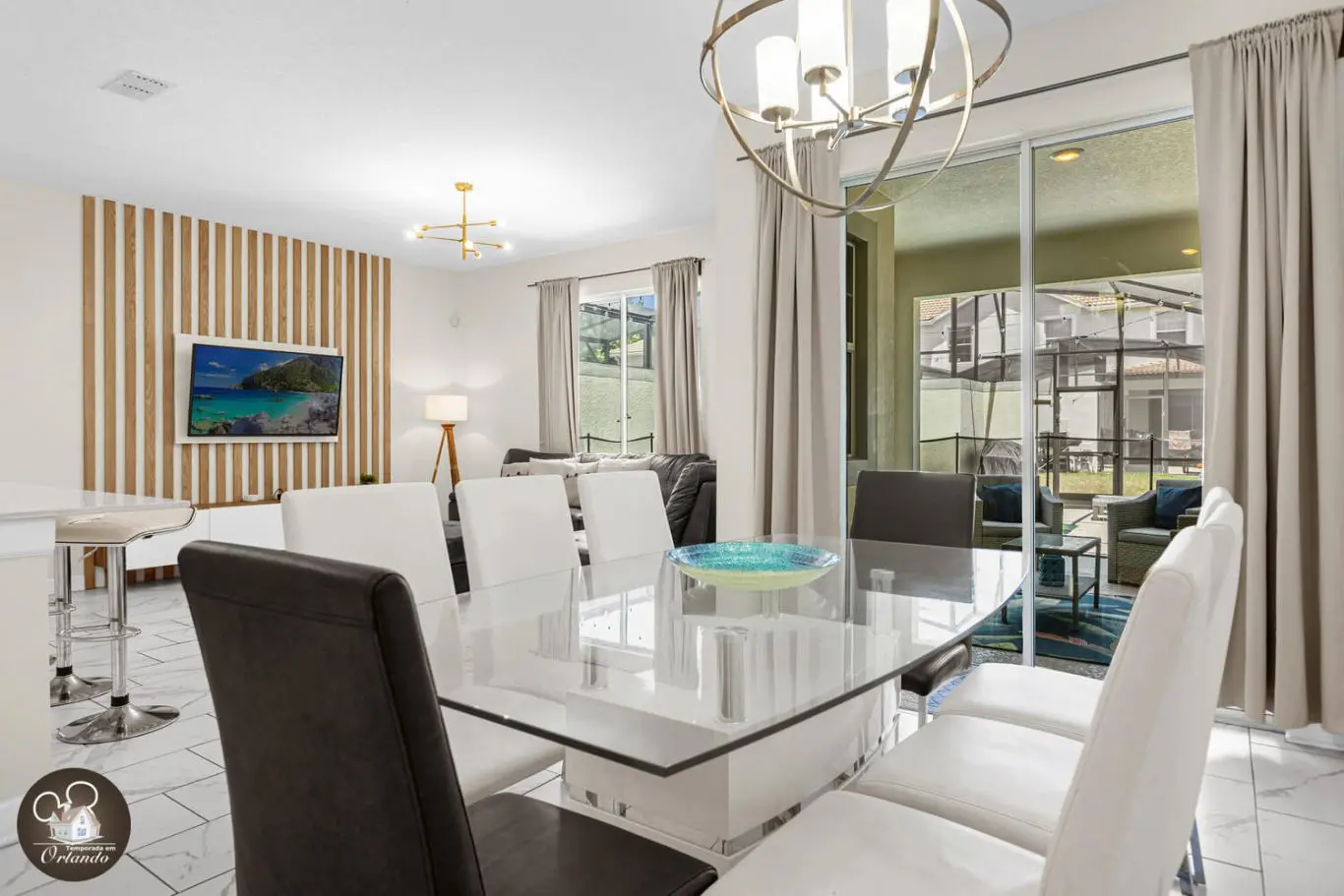 Ao entrar, você será recebido por um ambiente amplo e funcional com sala de TV, sala de jantar e cozinha americana. A decoração é harmoniosa, com tons claros e toque contemporâneo. A sala oferece vista e saída direta para a área externa com piscina, criando uma conexão natural entre lazer e descanso.