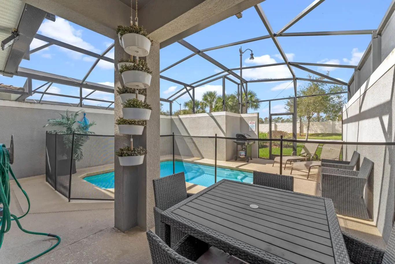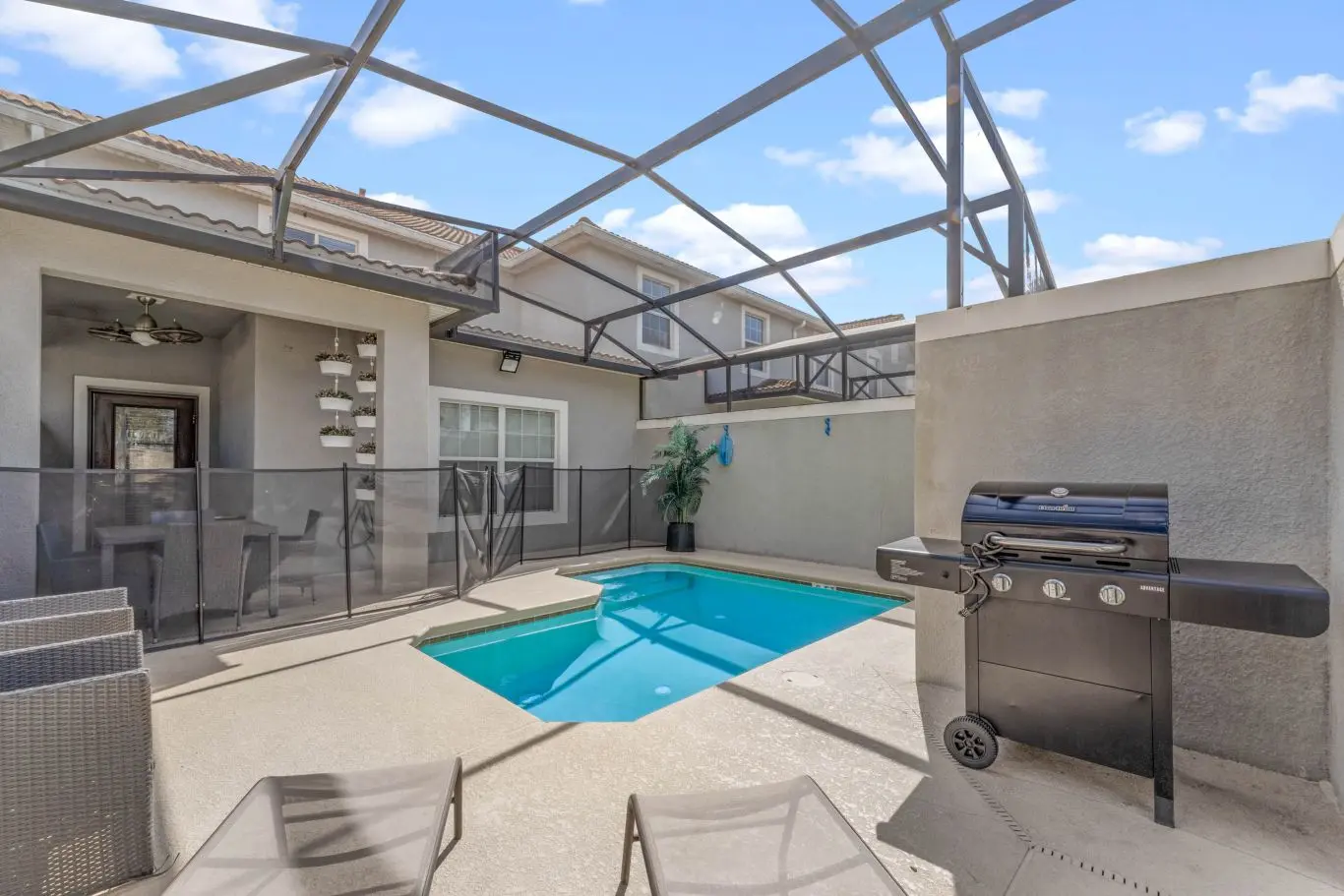 A piscina privativa, com acesso direto pela sala, é o destaque da área externa. Ideal para relaxar após um dia nos parques, tomar sol com privacidade ou curtir um fim de tarde tranquilo com a família.