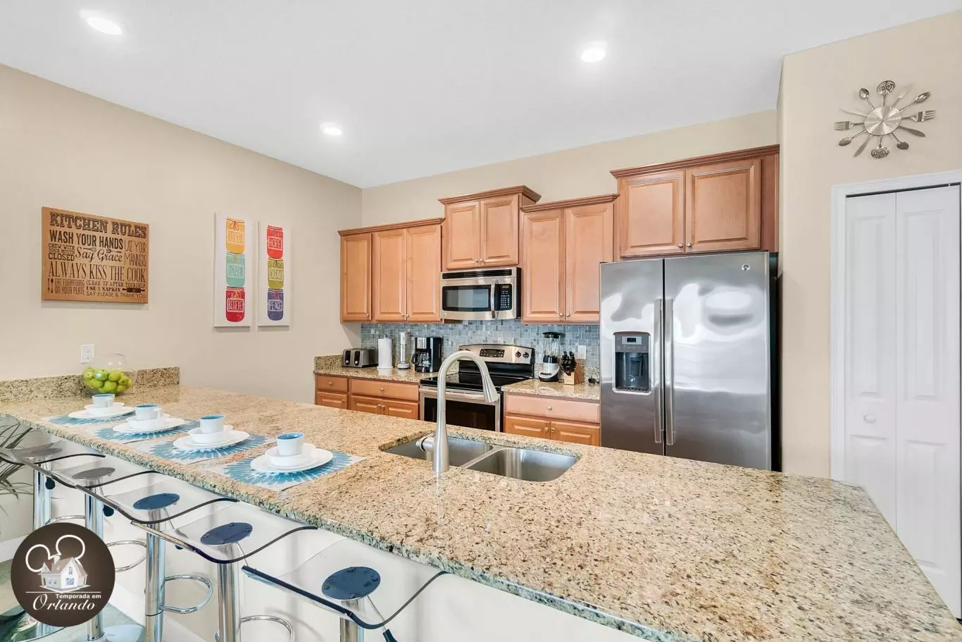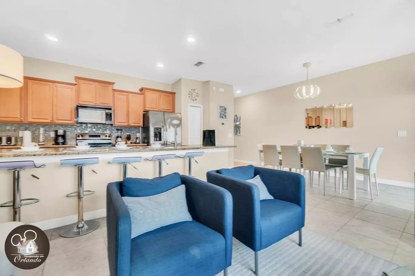 Minha família ficou uma semana nesta adorável casa em fevereiro com outra família de 4. O espaço era muito limpo e permitiu que ambas as famílias tivessem seu próprio espaço com 4 quartos e 3 banheiros. Não tivemos a chance de apreciar o quintal ou usar a piscina, mas passamos algumas horas na piscina comunitária com tobogã. Meus filhos adoraram as comodidades! Houve um pequeno contratempo com o check-in. Verifiquei que meu amigo chegaria à minha frente e nós dois confirmamos nossas informações de convidado, e foi informado que tudo seria resolvido. Infelizmente, devido a um voo tardio, meu convidado não chegou até depois da meia-noite. O segurança disse que eles não conseguiram encontrar as informações dela e foi preciso entrar em contato com a equipe para esclarecer. Felizmente, não foi muito incômodo, mas apenas um aborrecimento depois de ter uma liberação garantida que não seria um problema. Não houve outros problemas em nossa estadia. Definitivamente ficaríamos aqui novamente e o recomendamos totalmente a outras pessoas. É super fácil chegar à Disney!