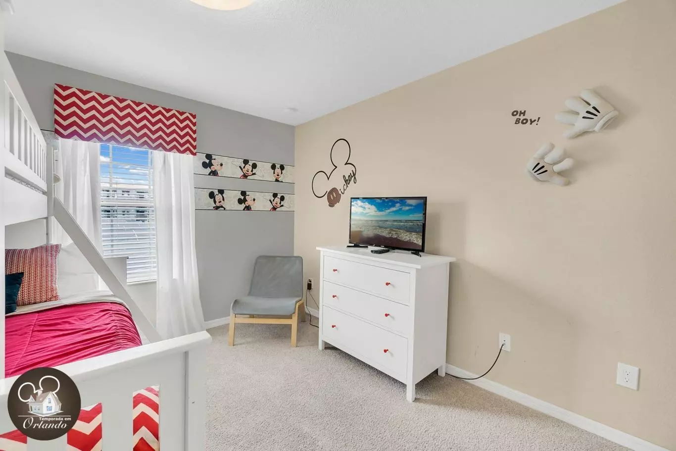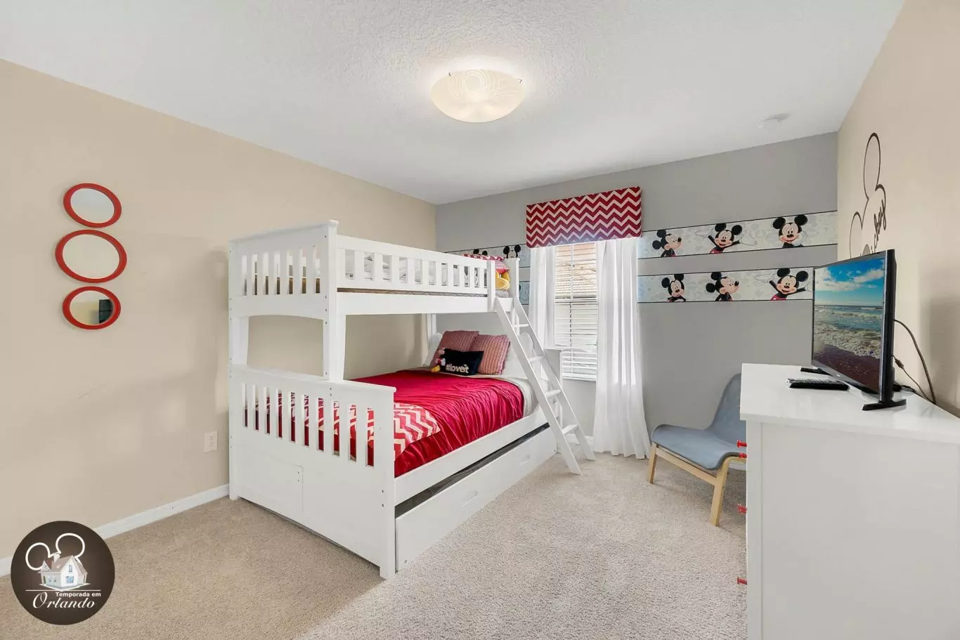 • Quarto 3: beliche com cama auxiliar e decoração do Mickey