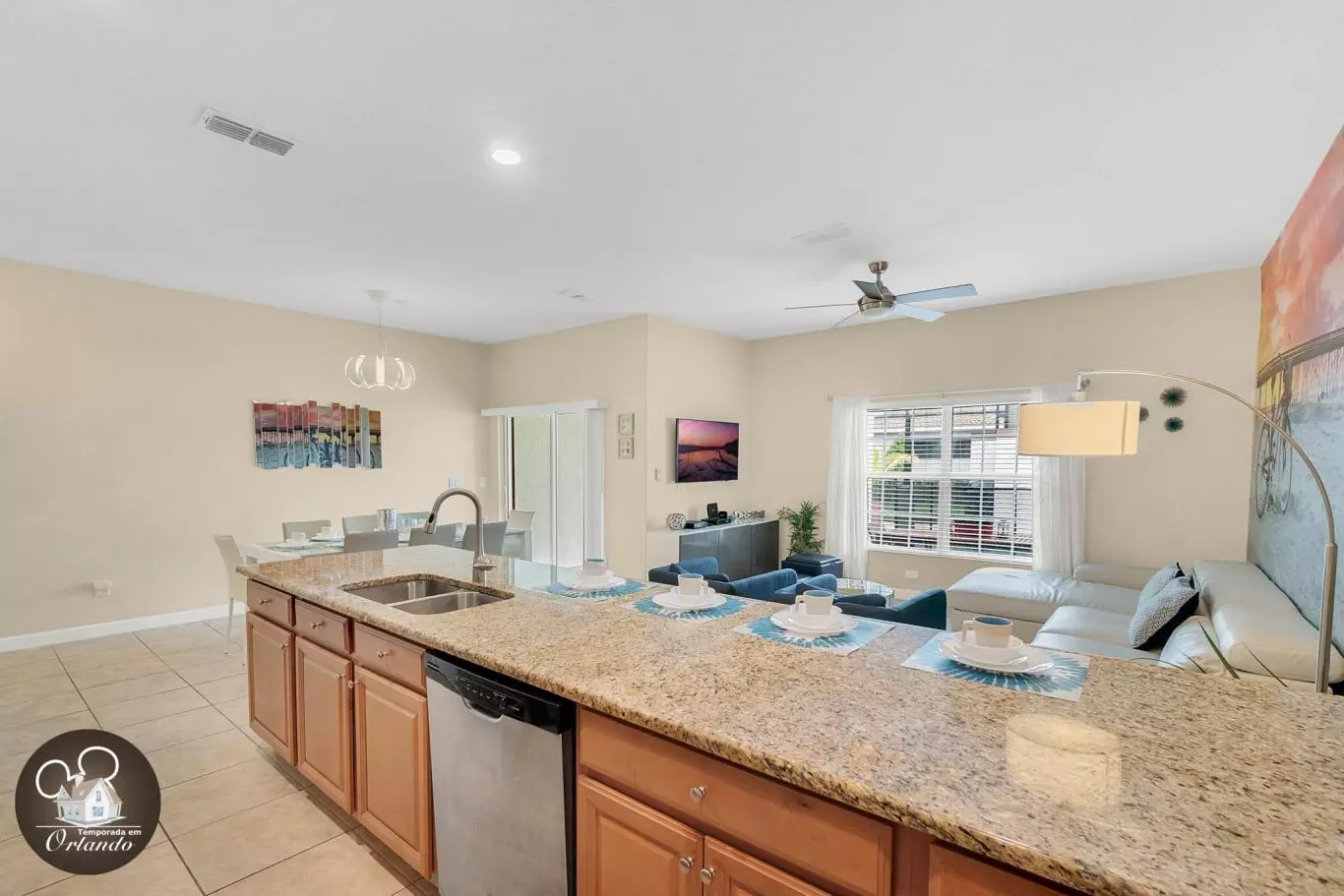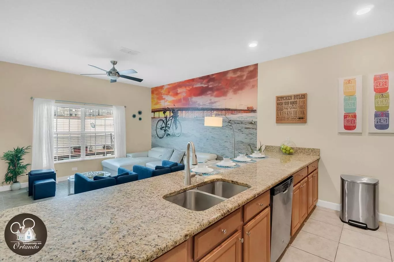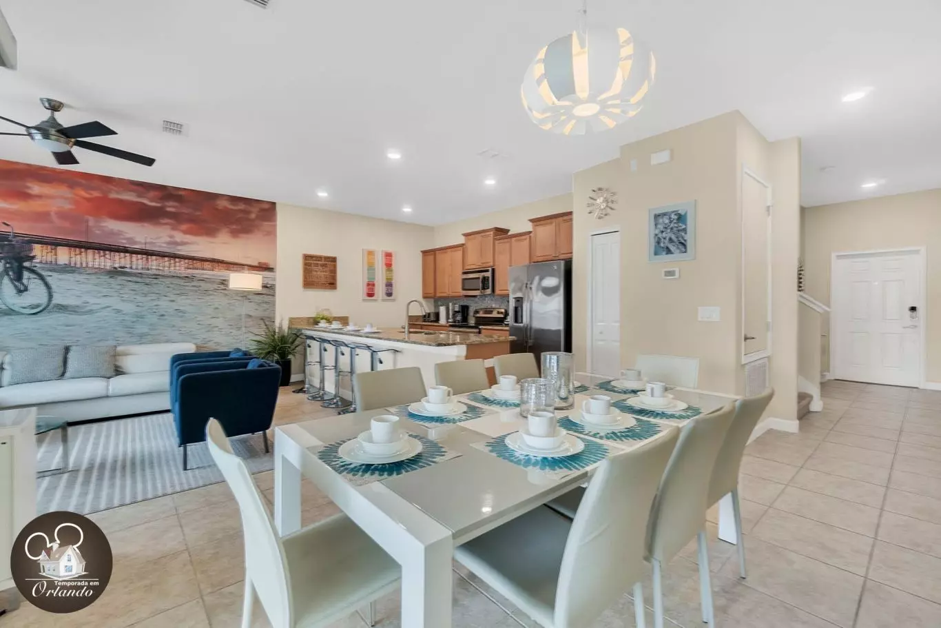 Logo na entrada, você encontra uma sala de TV, sala de jantar e uma cozinha americana integradas, criando um ambiente interativo e acolhedor. O destaque vai para a decoração arrojada com toque praiano e temas infantis que encantam os pequenos.