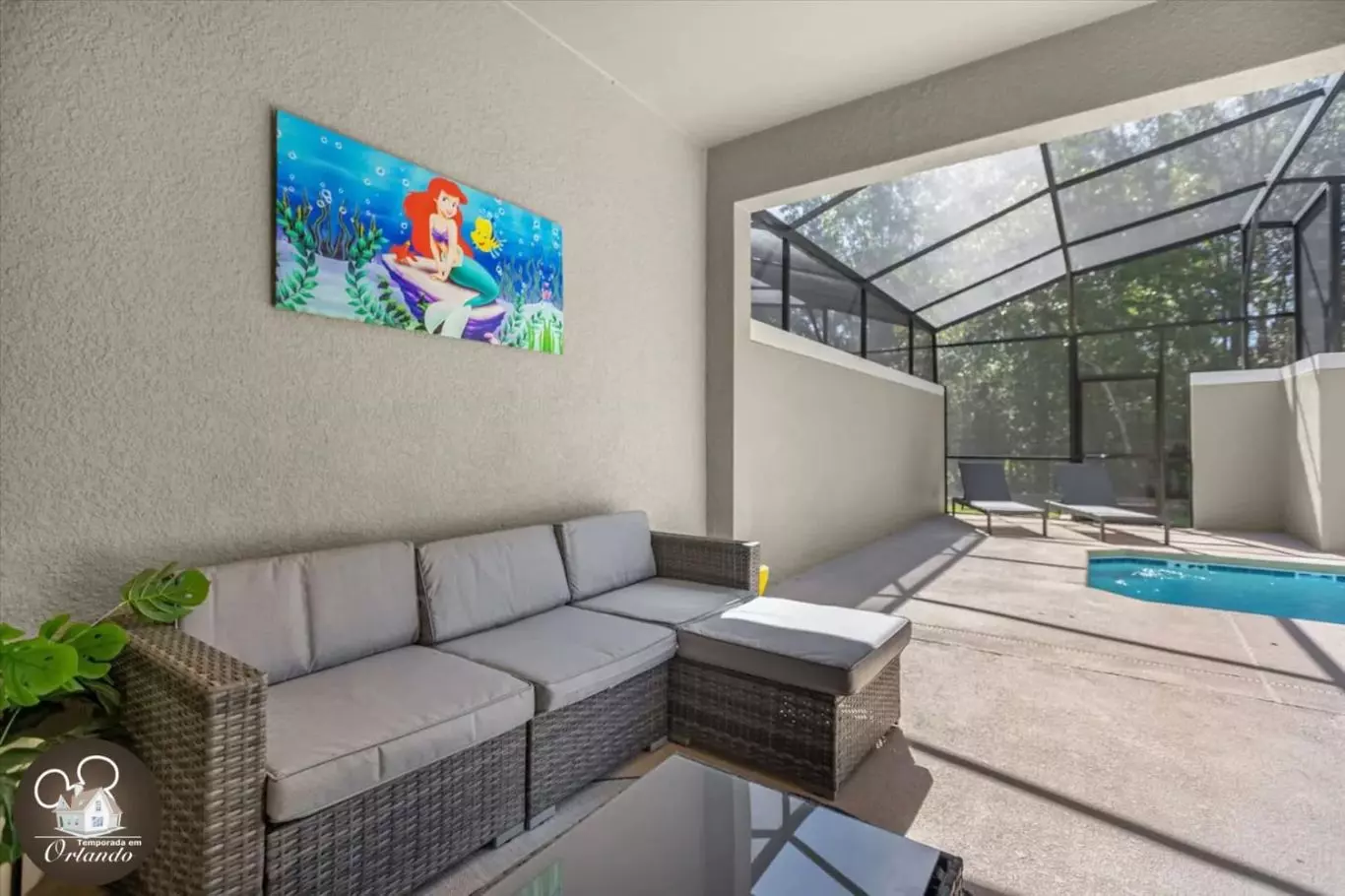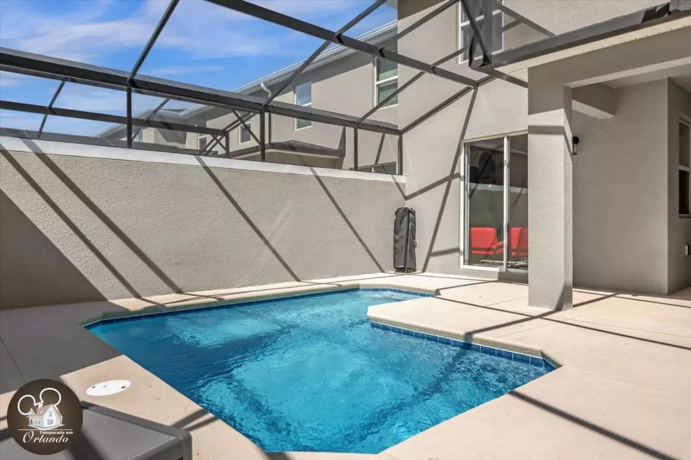A casa conta com uma piscina privativa equipada com espreguiçadeiras, perfeita para relaxar após um dia nos parques.