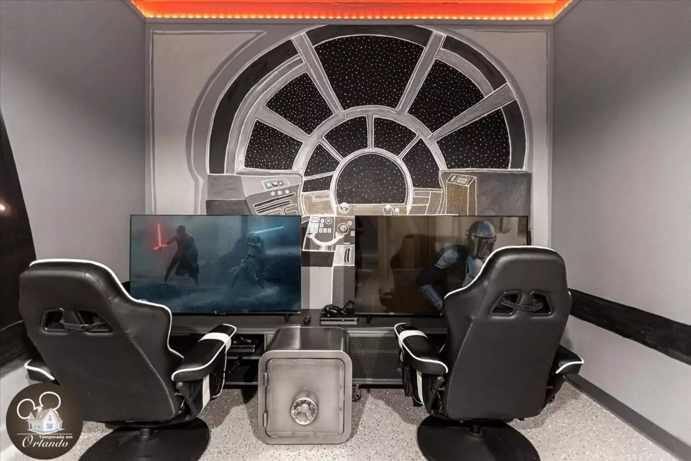 No piso superior, uma sala de descanso com assentos confortáveis oferece o espaço perfeito para sessões de filmes ou maratonas de séries em grupo.
