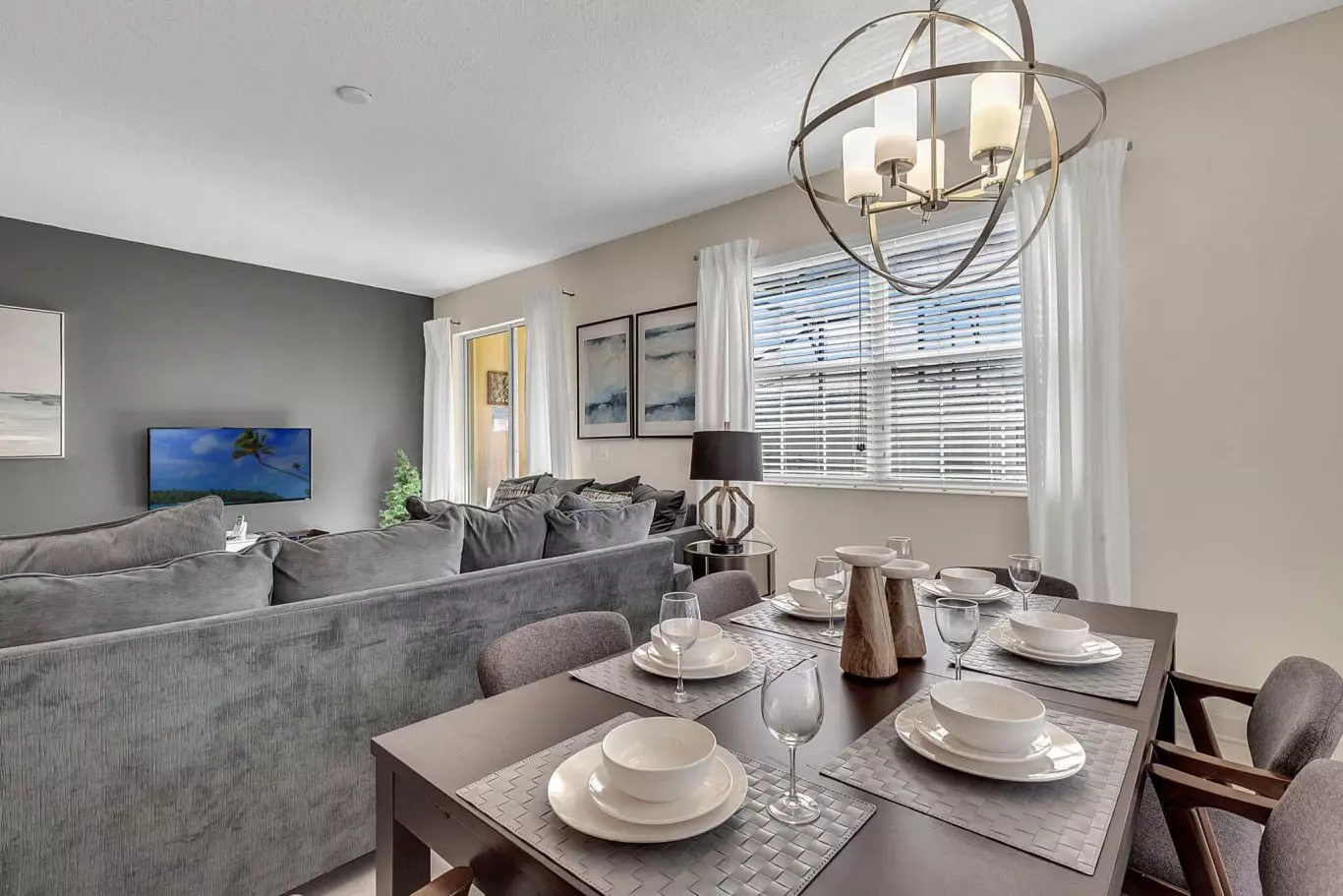 Na entrada, você encontra sala de TV, sala de jantar e cozinha no estilo americano, formando um espaço integrado que favorece a convivência. A decoração é leve, o ambiente é arejado e pensado para quem quer se sentir em casa, mesmo longe de casa.
