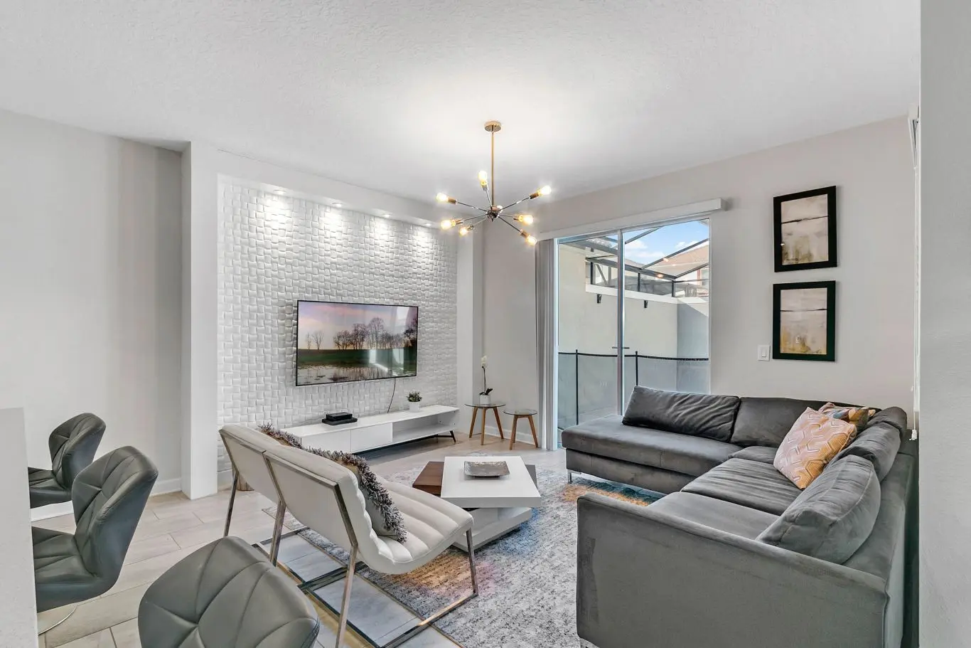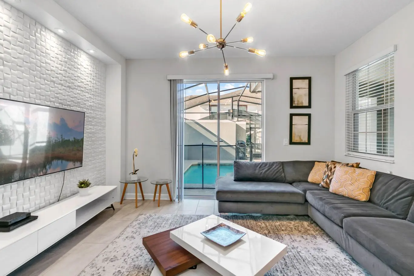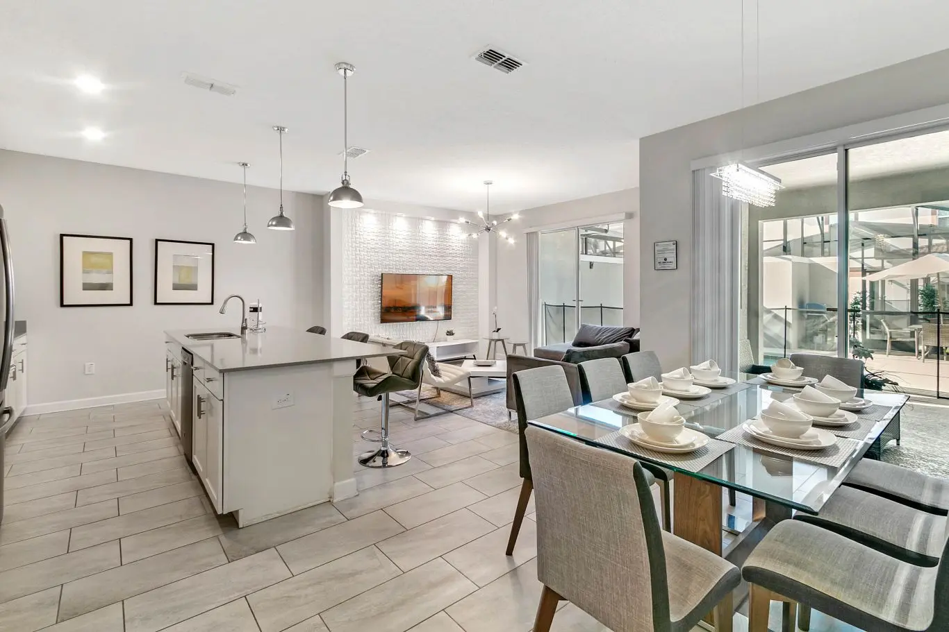 Ao entrar, você encontra um espaço amplo com sala de TV, sala de jantar e cozinha no estilo americano. A decoração é harmoniosa e moderna, com ambientes claros e bem distribuídos. A sala oferece acesso direto à piscina privativa, proporcionando praticidade e conforto.