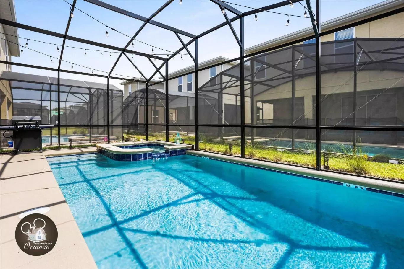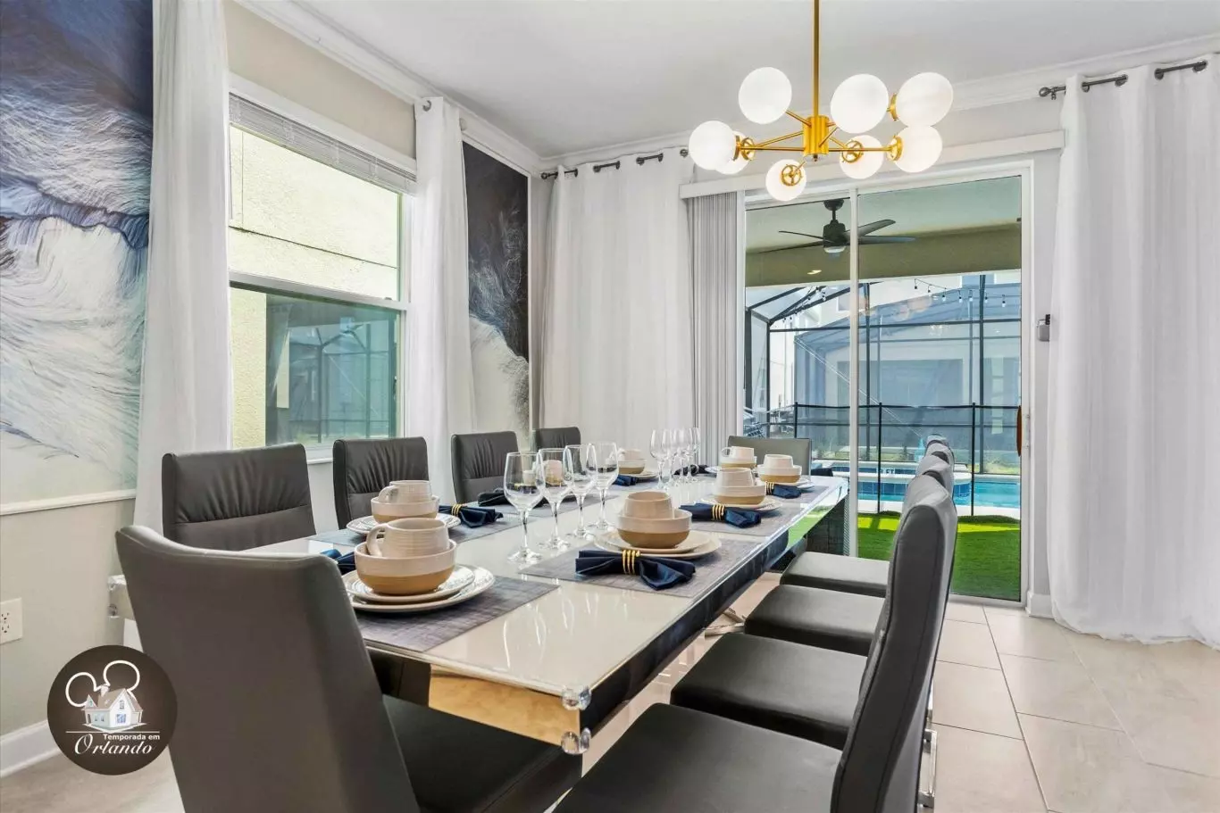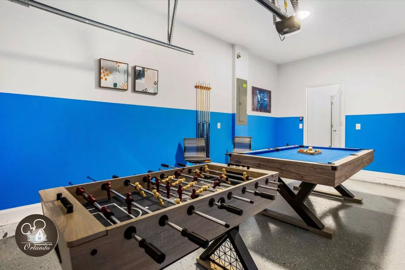 A área de lazer da casa oferece uma piscina privativa e um salão de jogos completo. Ideal para relaxar, se divertir ou tomar um café da manhã ao ar livre após um dia nos parques.