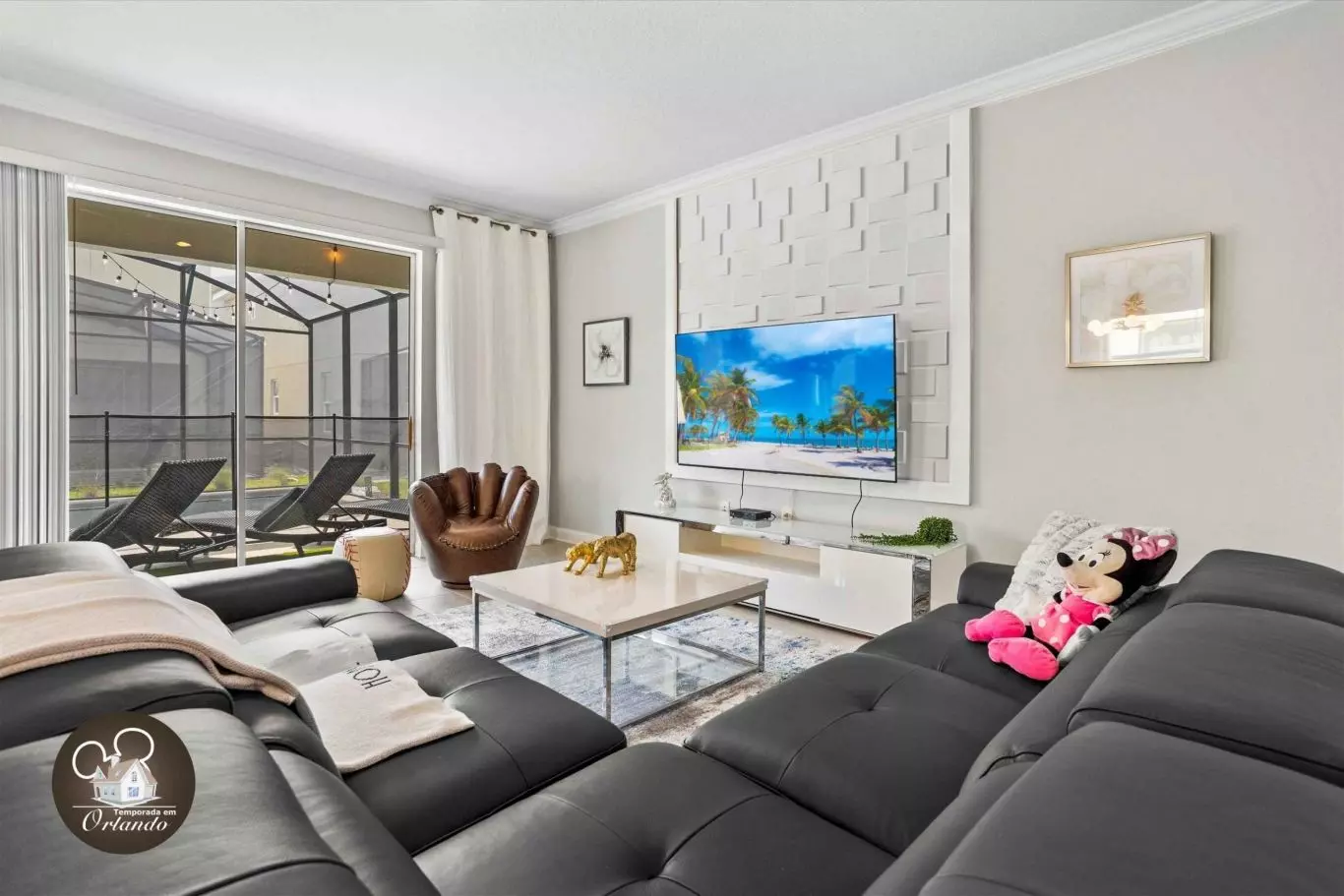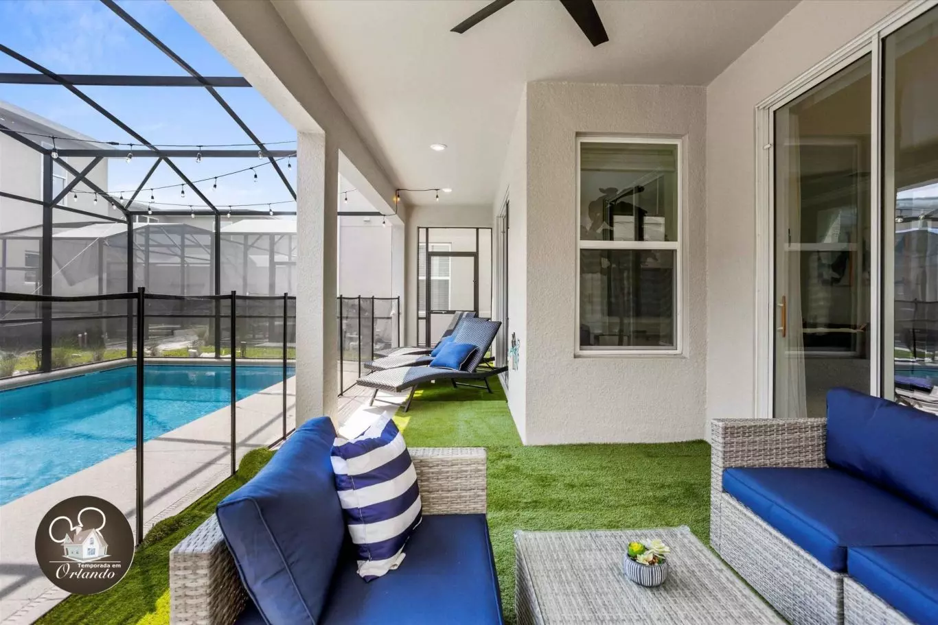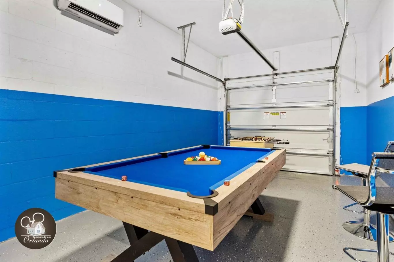 A área de lazer da casa oferece uma piscina privativa e um salão de jogos completo. Ideal para relaxar, se divertir ou tomar um café da manhã ao ar livre após um dia nos parques.