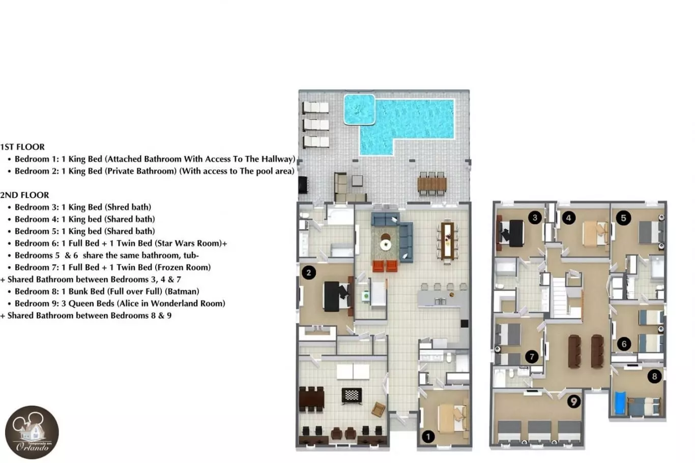 A casa é muito divertida, ótima vista para os belos lagos, e todos adoraram os quartos temáticos e a sala de jogos. A casa era imaculada e super confortável. A comunicação foi muito clara e a localização é ótima. Sentiu-se seguro com toda a segurança que eles têm. Um ótimo valor, você poderia dormir um time de beisebol inteiro lá por dias pelo custo de dois quartos na Disney por uma noite. Altamente recomendado!