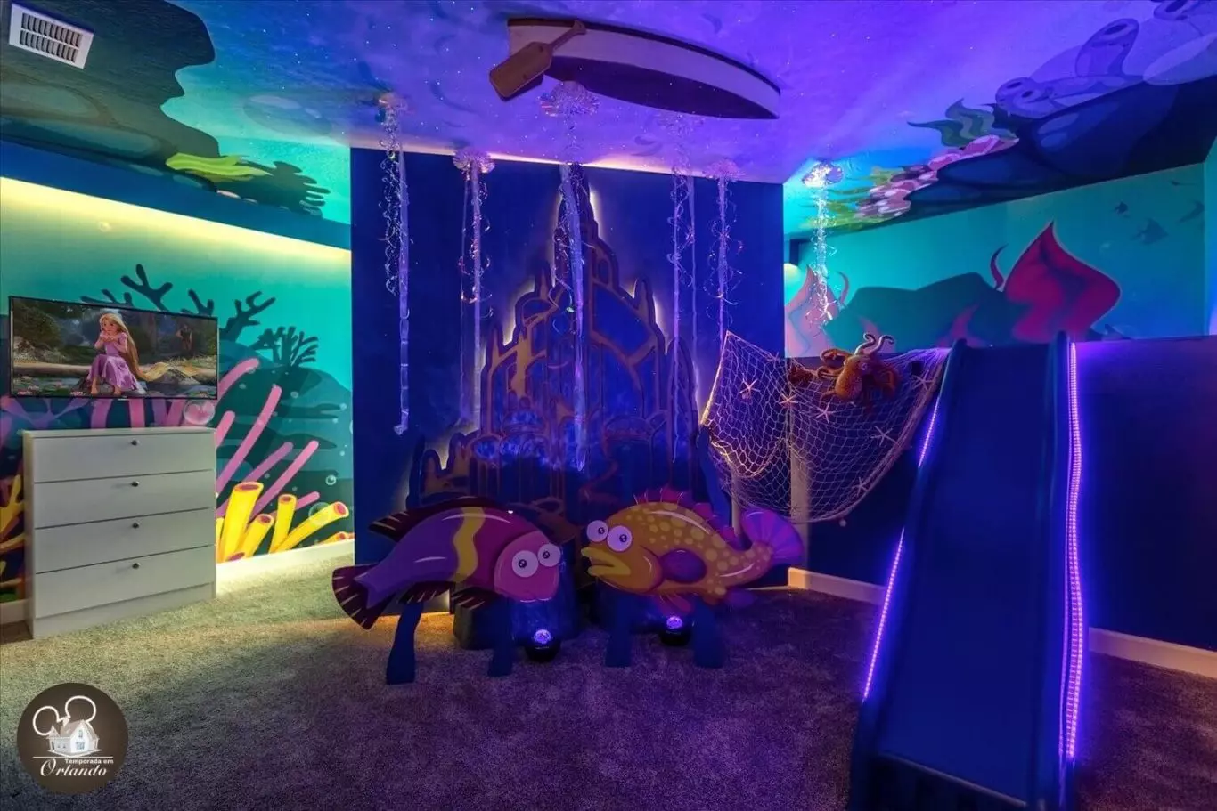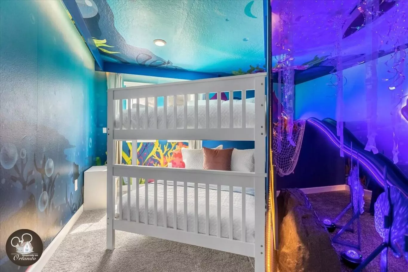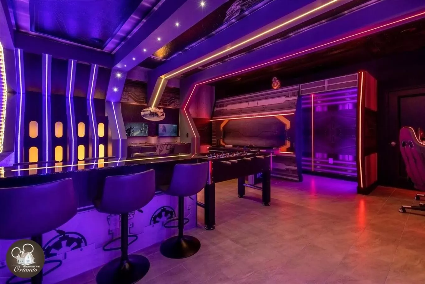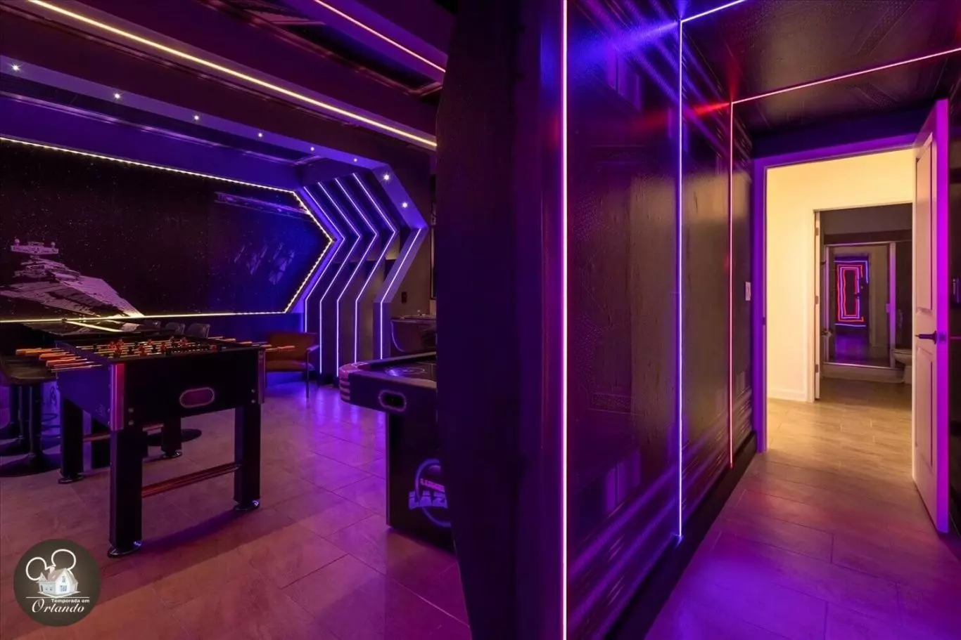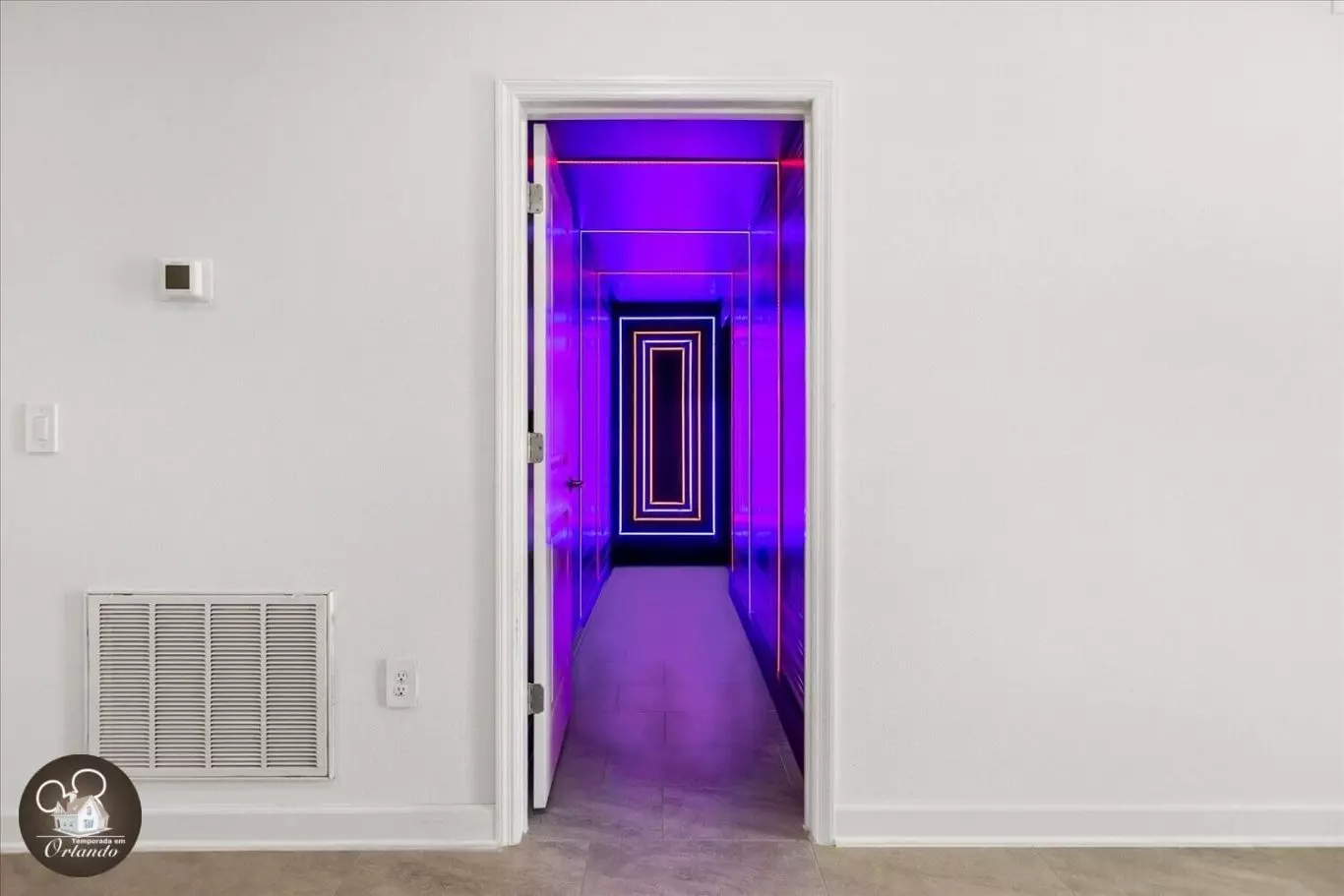 Lindo layout moderno. O destaque da casa foi a sala de jogos. Simplesmente adorável. Os quartos também eram deslumbrantes. Luminárias lindas em todos os ambientes. Um dos meus quartos favoritos era o quarto da sereia, bem como a sala de telefone vermelha. Tão criativo. Se você estiver viajando com a família para aproveitar a área da Disney, esta acomodação seria perfeita para você.
