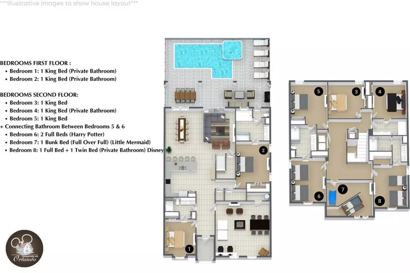 Casa para temporada em Orlando com 8 quartos, piscina privativa e salão de jogos – Acomoda até 20 pessoas!