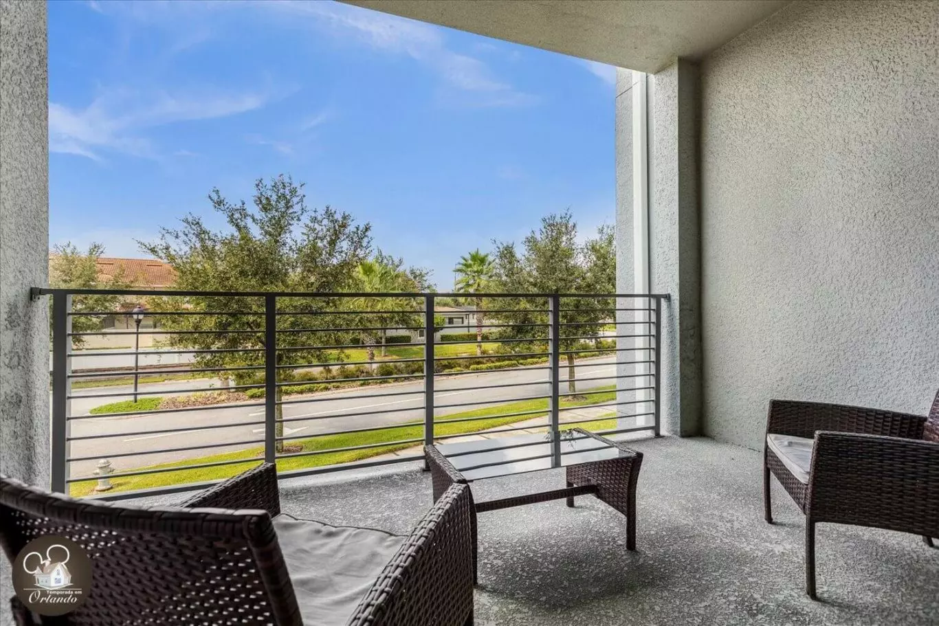 A sacada ampla permite curtir o clima da Flórida e relaxar após os passeios.