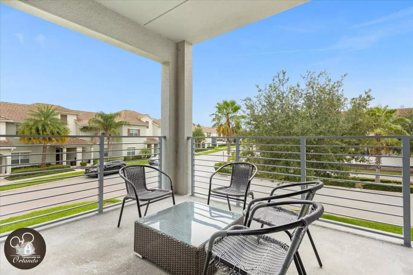 A sacada ampla oferece uma vista relaxante, perfeita para aproveitar o pôr do sol da Flórida após um dia nos parques.