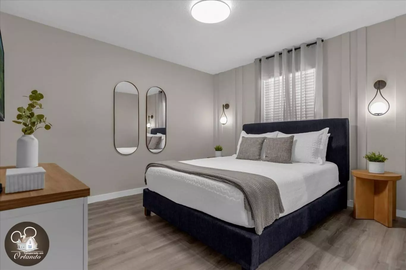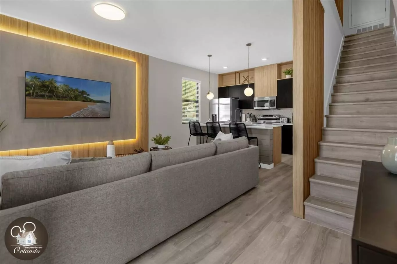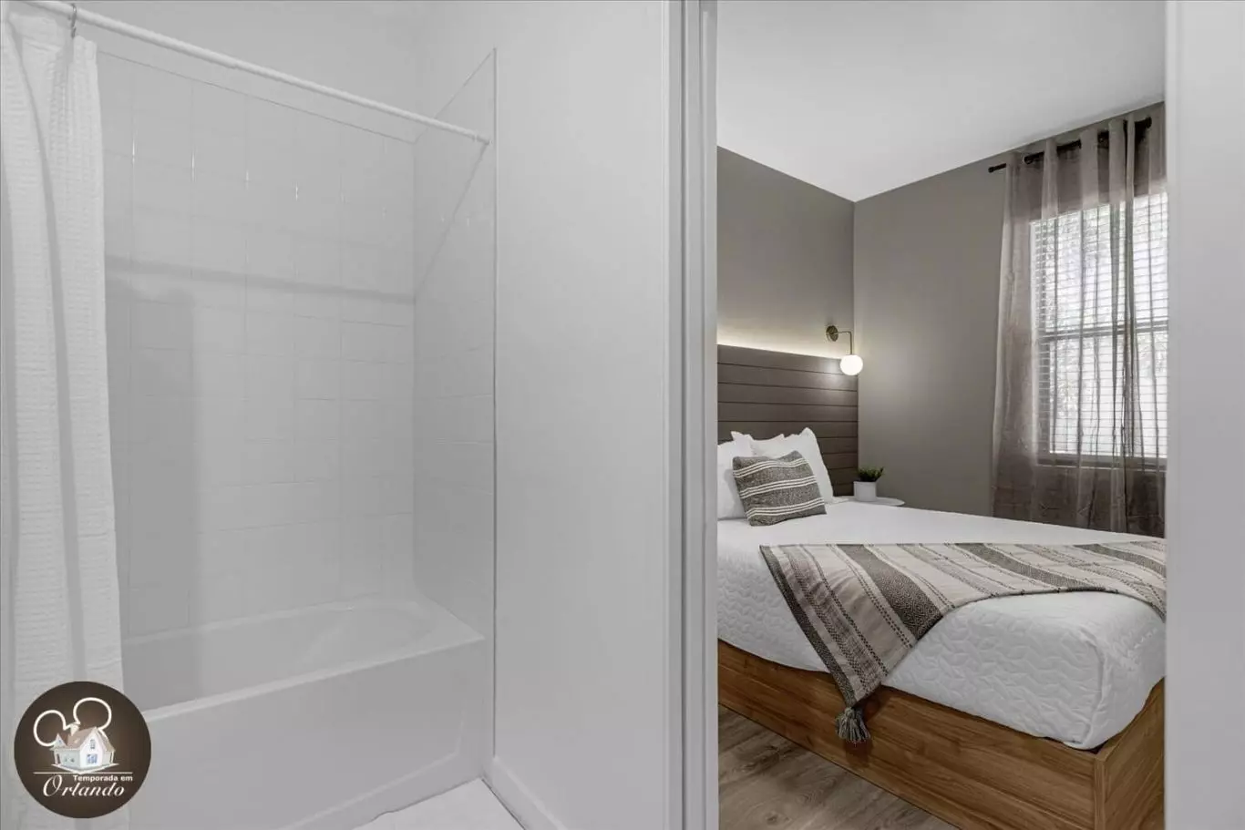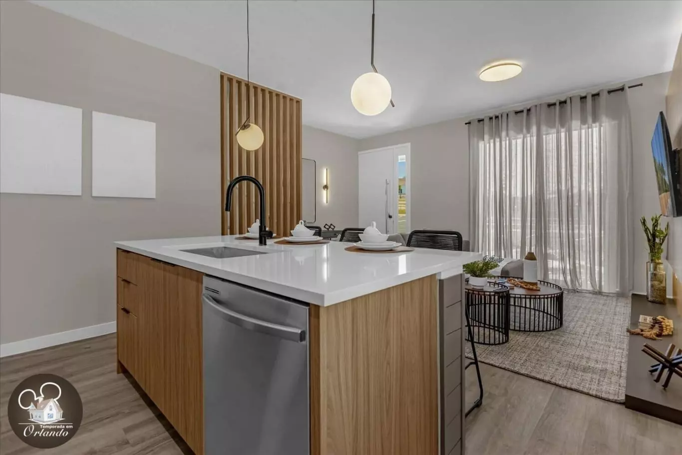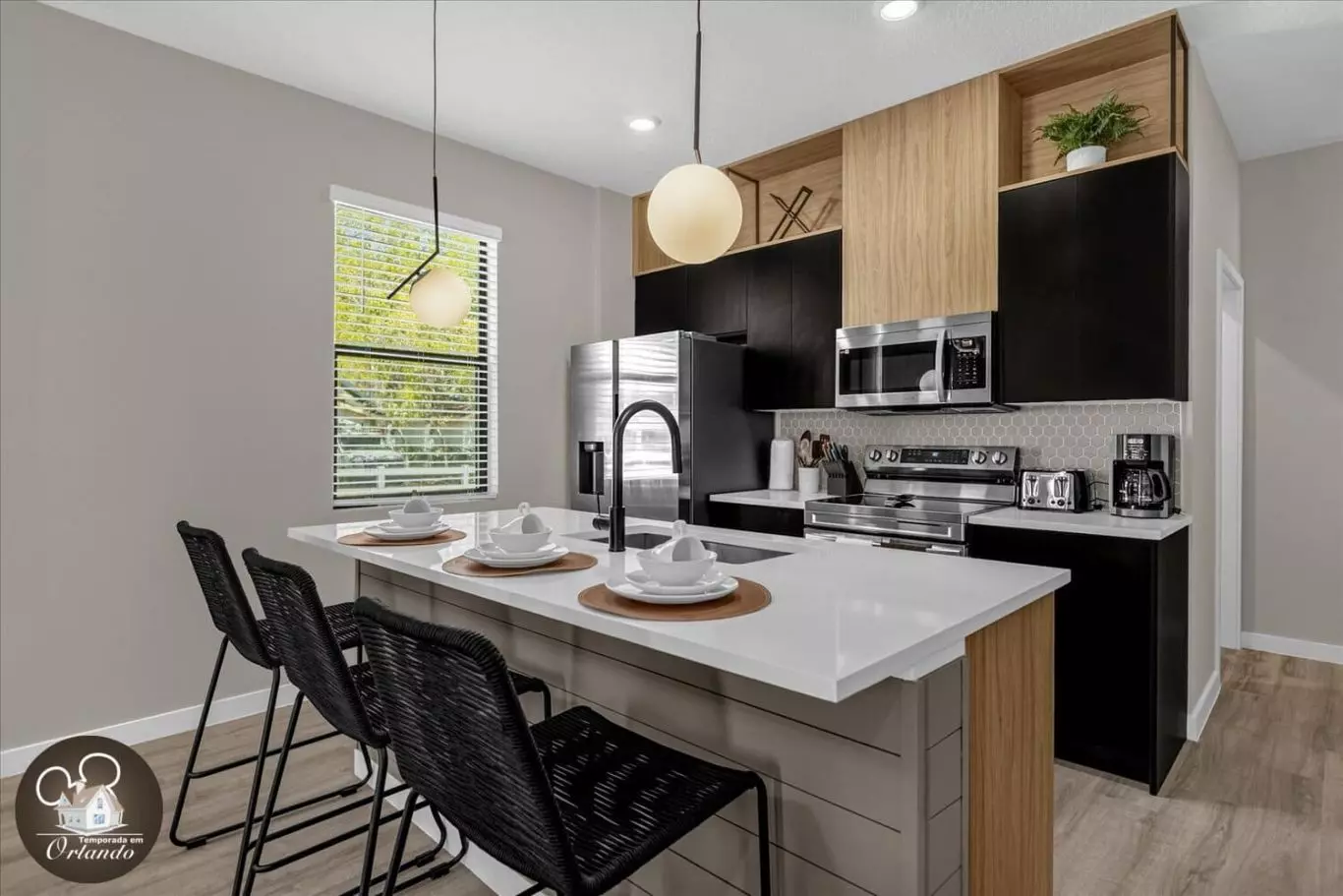 Ao entrar, você será recebido por uma sala de estar integrada com sala de jantar e cozinha americana. A decoração é harmoniosa, com móveis novos, iluminação natural e ambientes bem distribuídos. Cada detalhe foi pensado para tornar sua experiência em Orlando inesquecível.