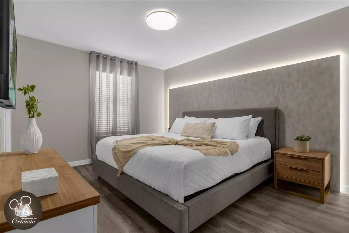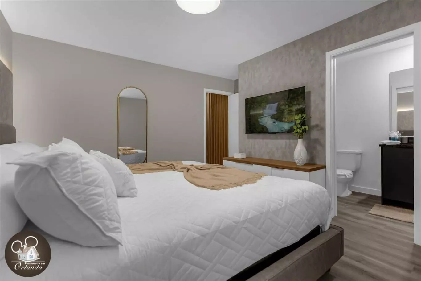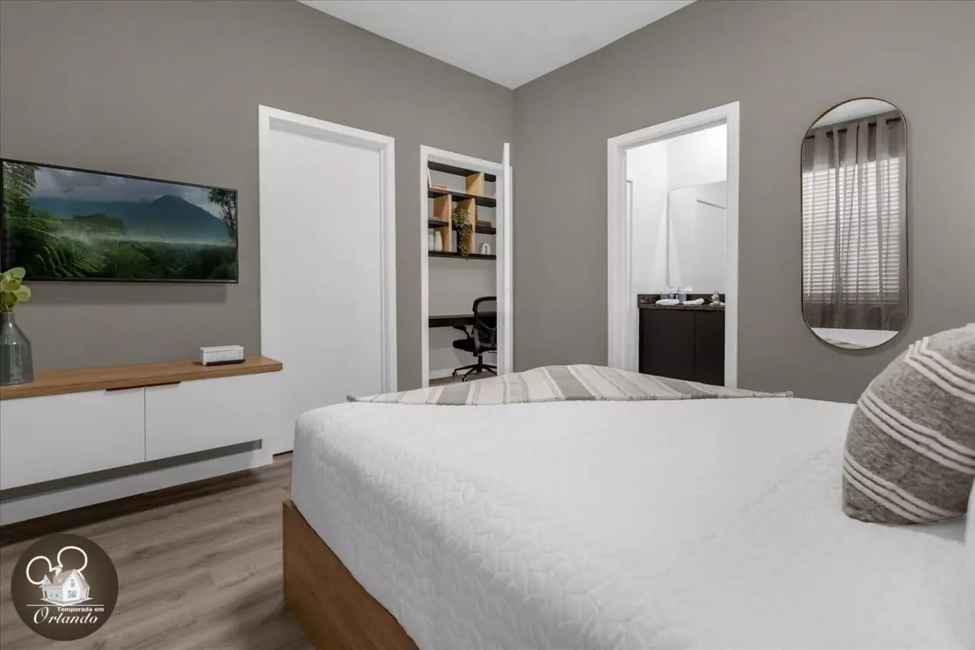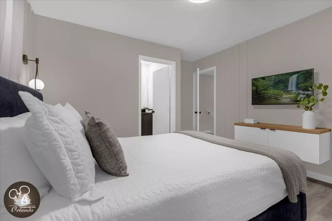 Ao entrar, você será recebido por uma sala de estar integrada com sala de jantar e cozinha americana. A decoração é harmoniosa, com móveis novos, iluminação natural e ambientes bem distribuídos. Cada detalhe foi pensado para tornar sua experiência em Orlando inesquecível.
