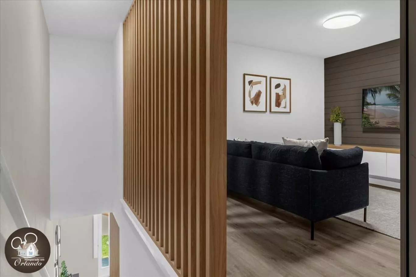 A sala de descanso no andar superior é um espaço ideal para assistir filmes ou simplesmente relaxar após um dia repleto de aventuras nos parques. Um verdadeiro refúgio para toda a família.