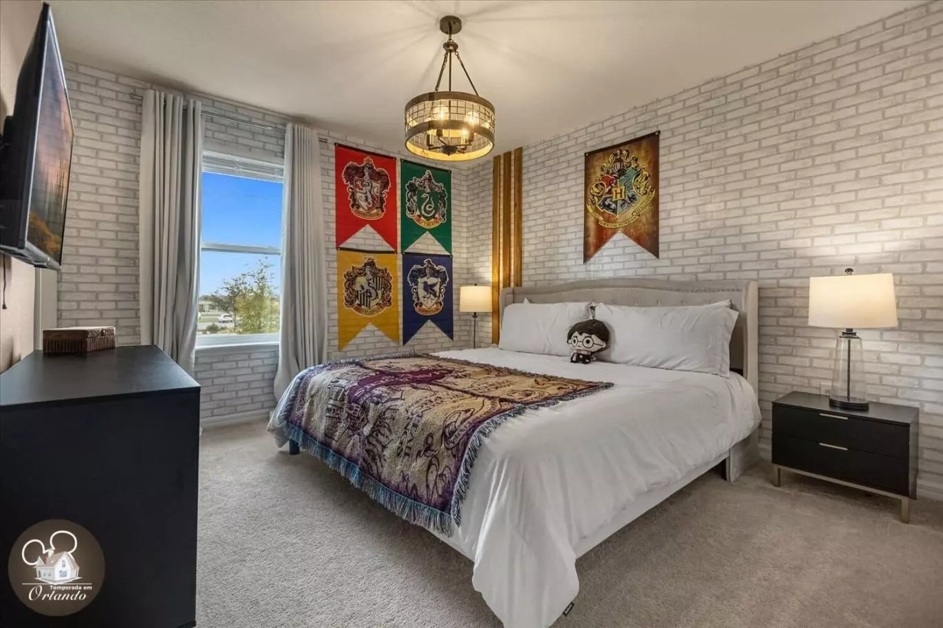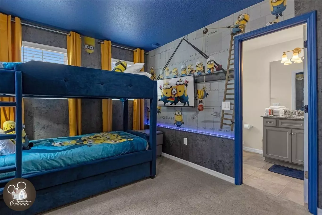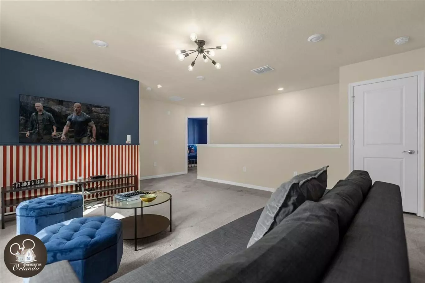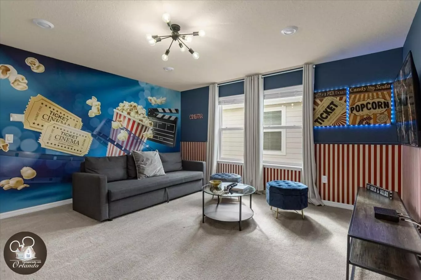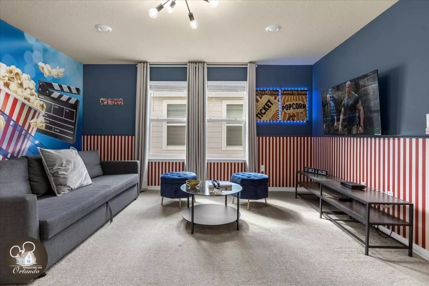 Um espaço dedicado para relaxamento e entretenimento, ideal para assistir a filmes ou simplesmente aproveitar o conforto após um dia nos parques.