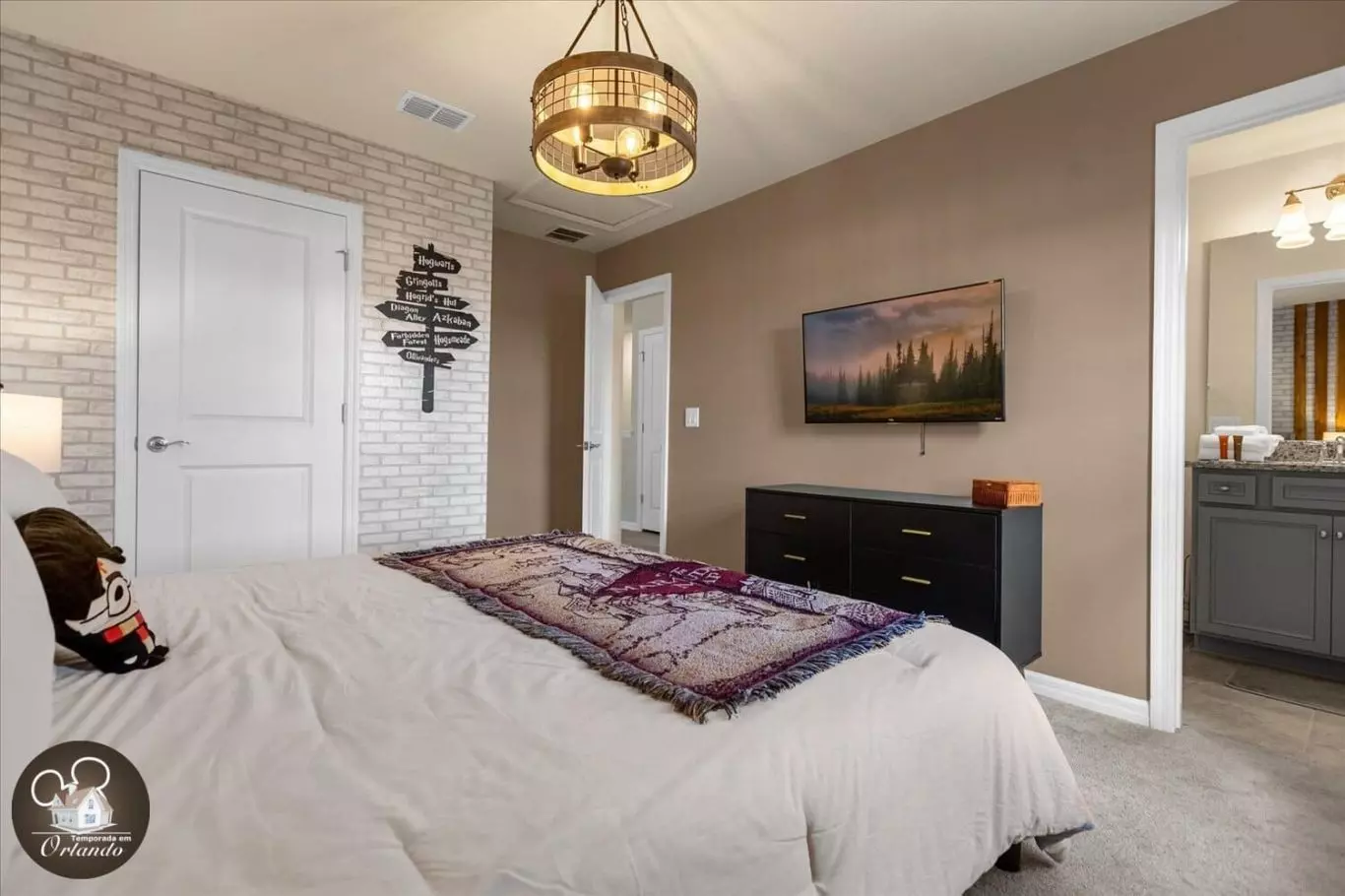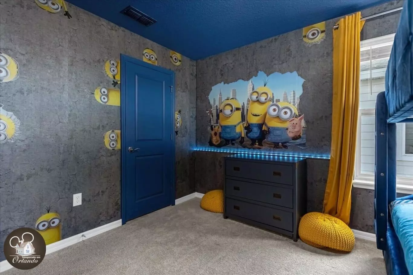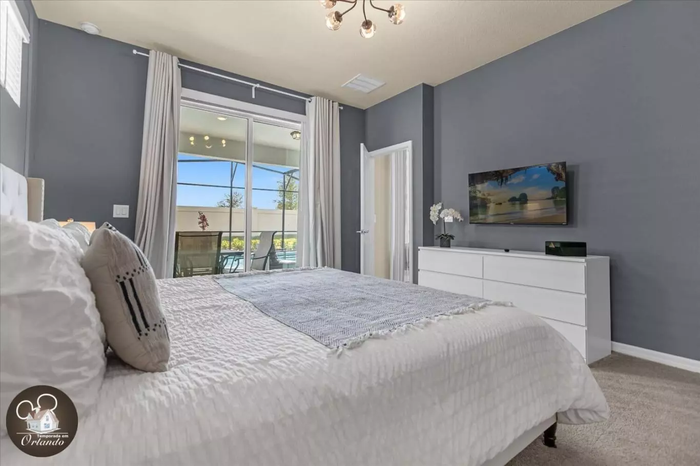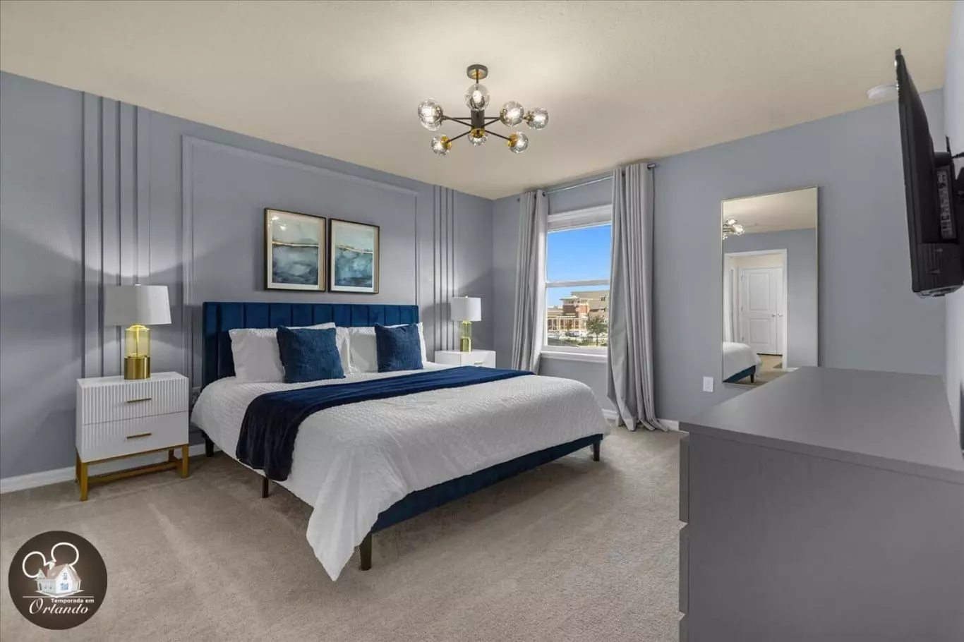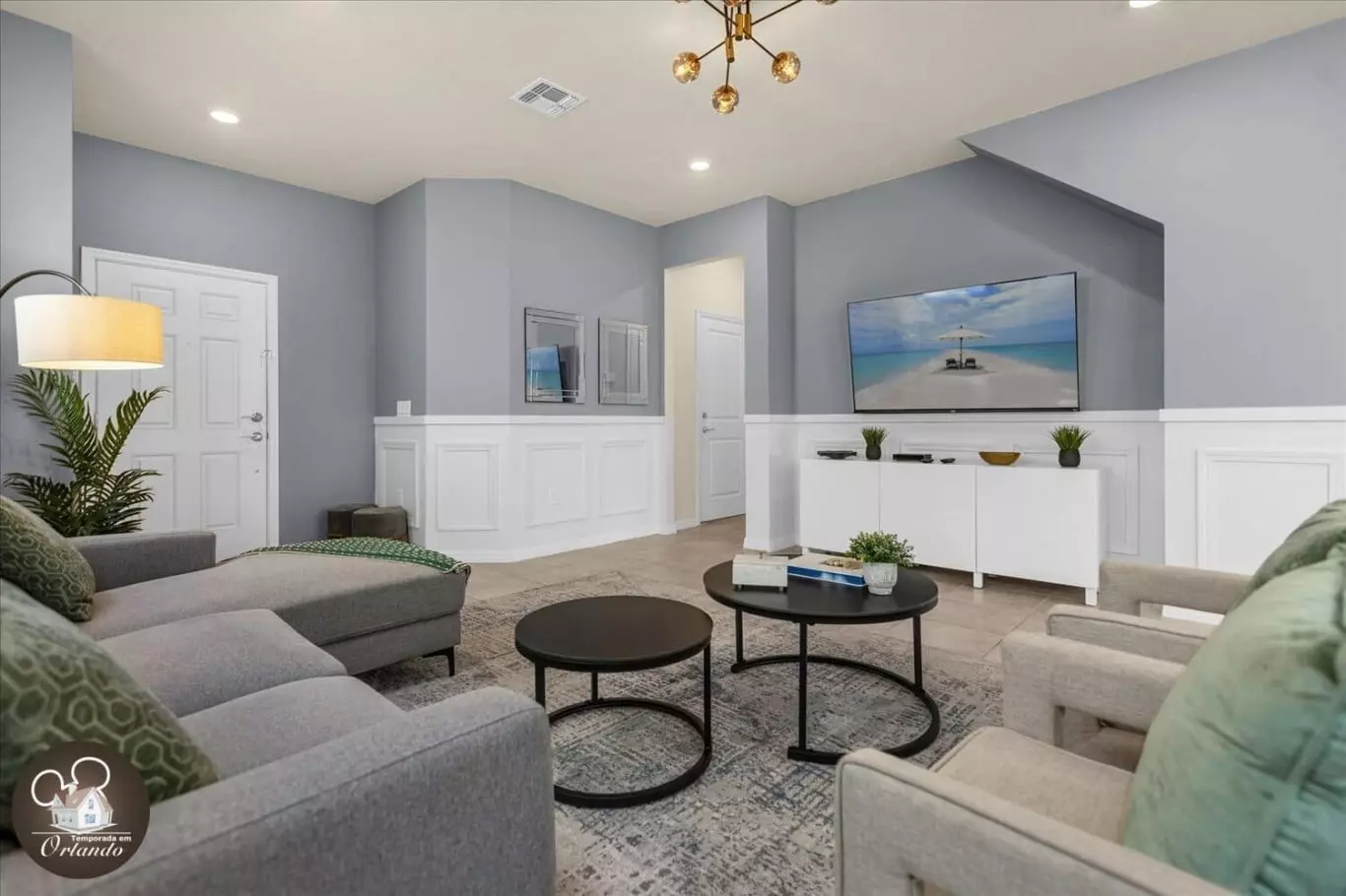 Um espaço dedicado para relaxamento e entretenimento, ideal para assistir a filmes ou simplesmente aproveitar o conforto após um dia nos parques.