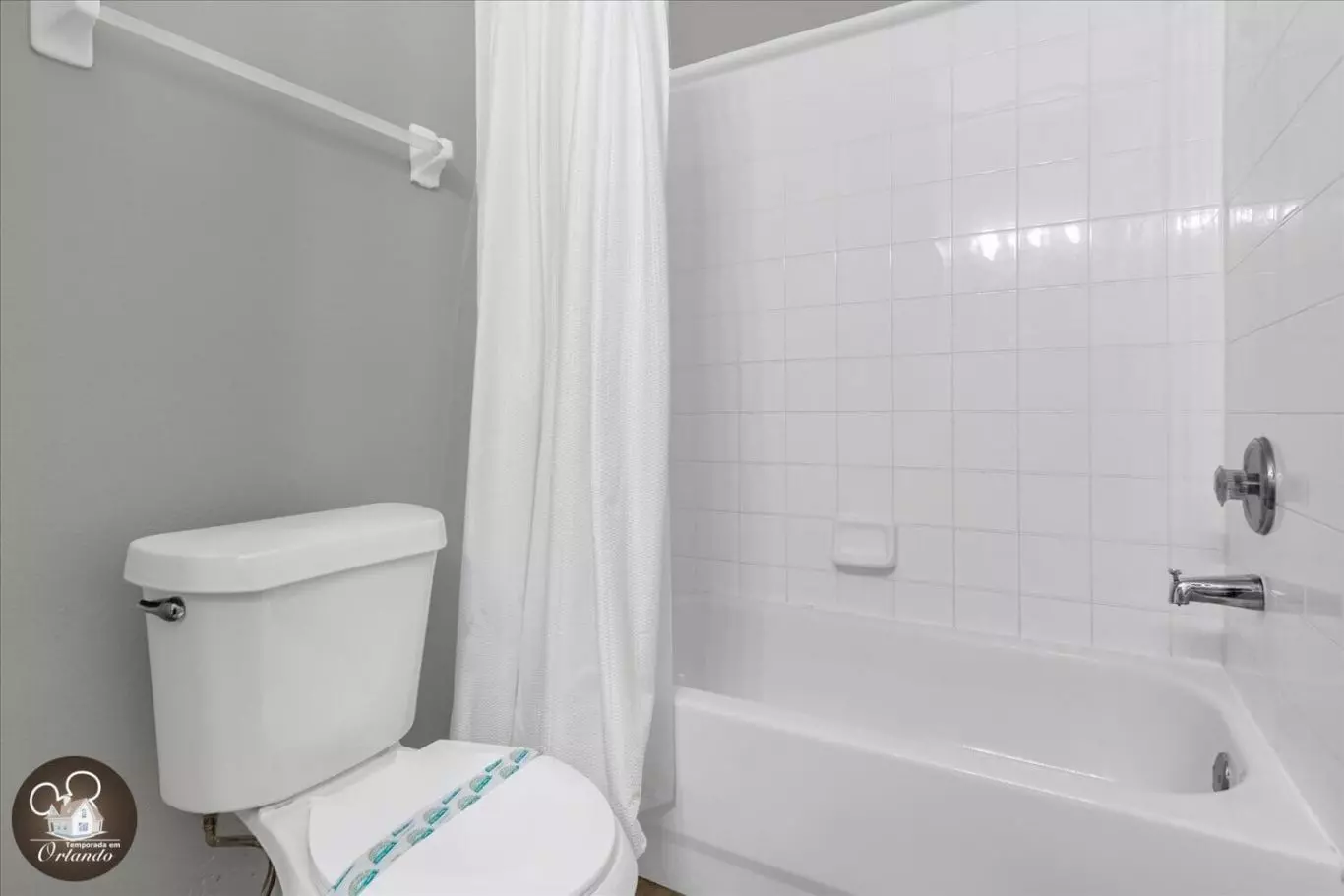 Um banheiro completo entre os dois quartos, garantindo praticidade e comodidade para todos